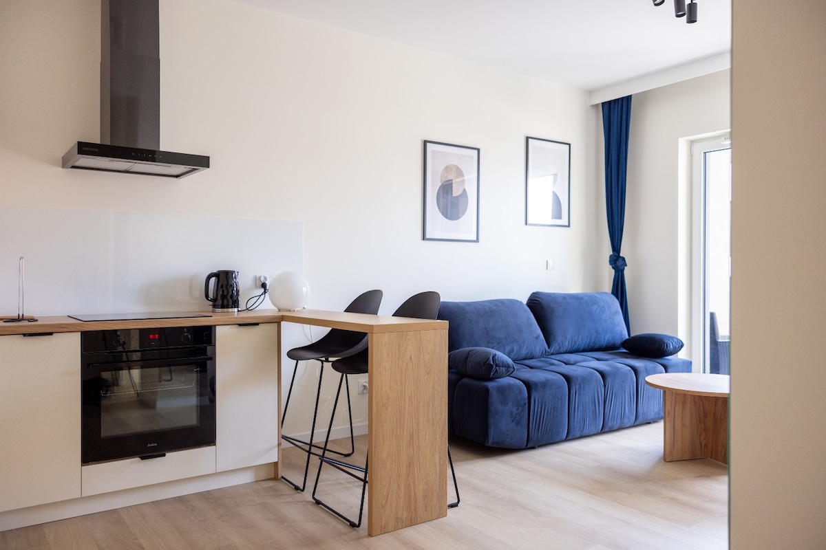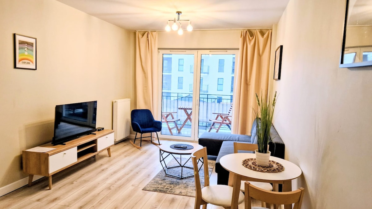 Stylowy apartament na 1. piętrze nowoczesnego drapacza chmur w centrum Łodzi (ul. Wigury 23). Do dyspozycji mały, prywatny taras – idealny na poranną kawę lub wieczorny relaks. W budynku dostępne są dwie windy od poziomu 0. Apartament został zaprojektowany z myślą o Twojej wygodzie – znajdziesz tu w pełni wyposażoną kuchnię z piekarnikiem i zmywarką, szybkie Wi-Fi oraz dostęp do aplikacji i programów TV – wszystko w cenie pobytu.