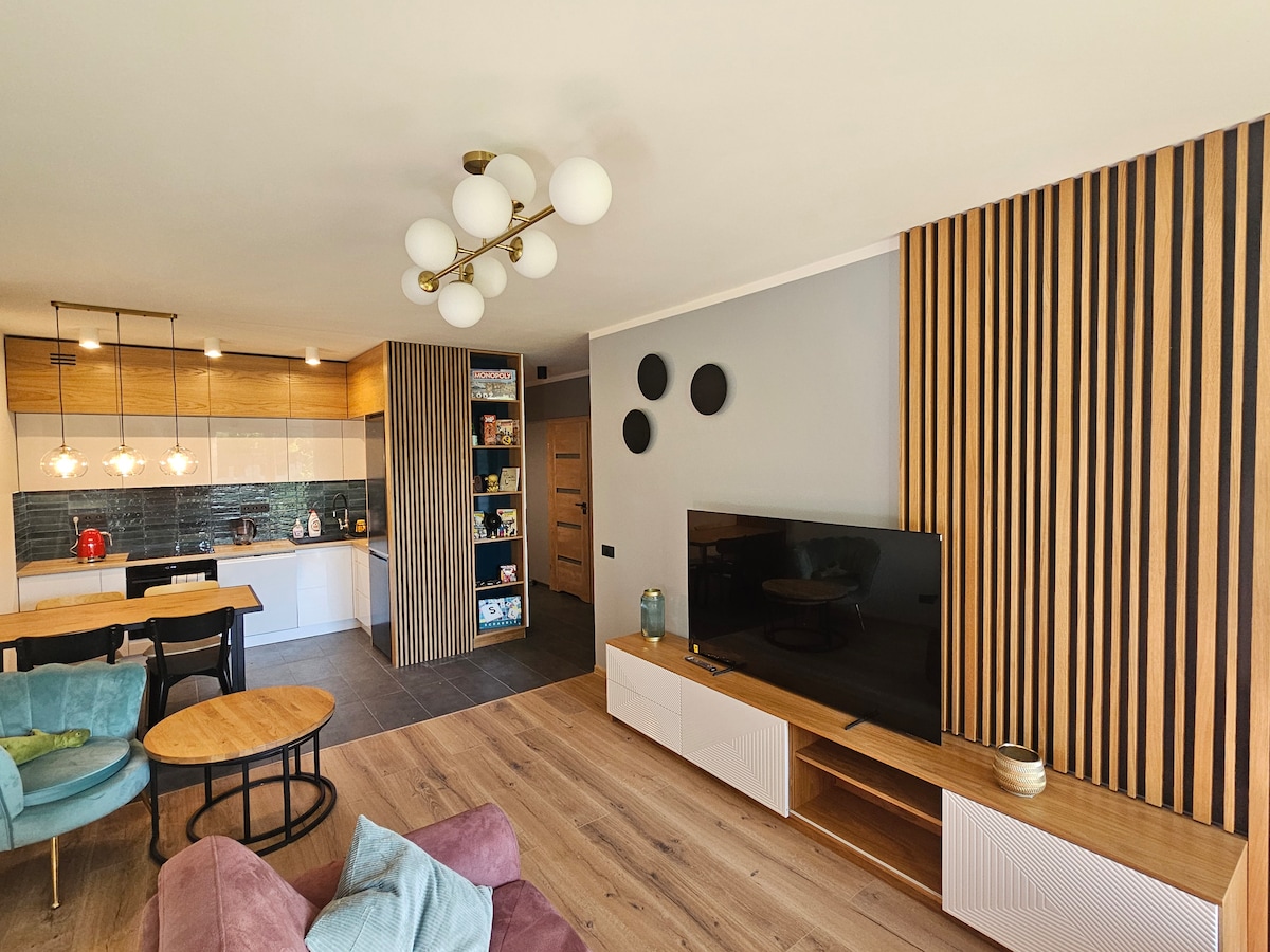Miejsce położone w centrum - czeka na Ciebie spokój i komfort. Luksusowy apartament z dwoma sypialniami, salonem, kuchnią łazienką oraz dużym tarasem jest wyposażony we wszystko co potrzebne do krótkiego i długiego pobytu. Na przeciwko jest centrum Manufaktura ze sklepami, restauracjami, kinem, ścianką wspinaczkową, siłownią. Park Staromiejski 800m. Parking na terenie zamkniętego osiedla bezpłatny. Doskonałe miejsce na bazę noclegową do zwiedzania miasta oraz pobyt biznesowy.