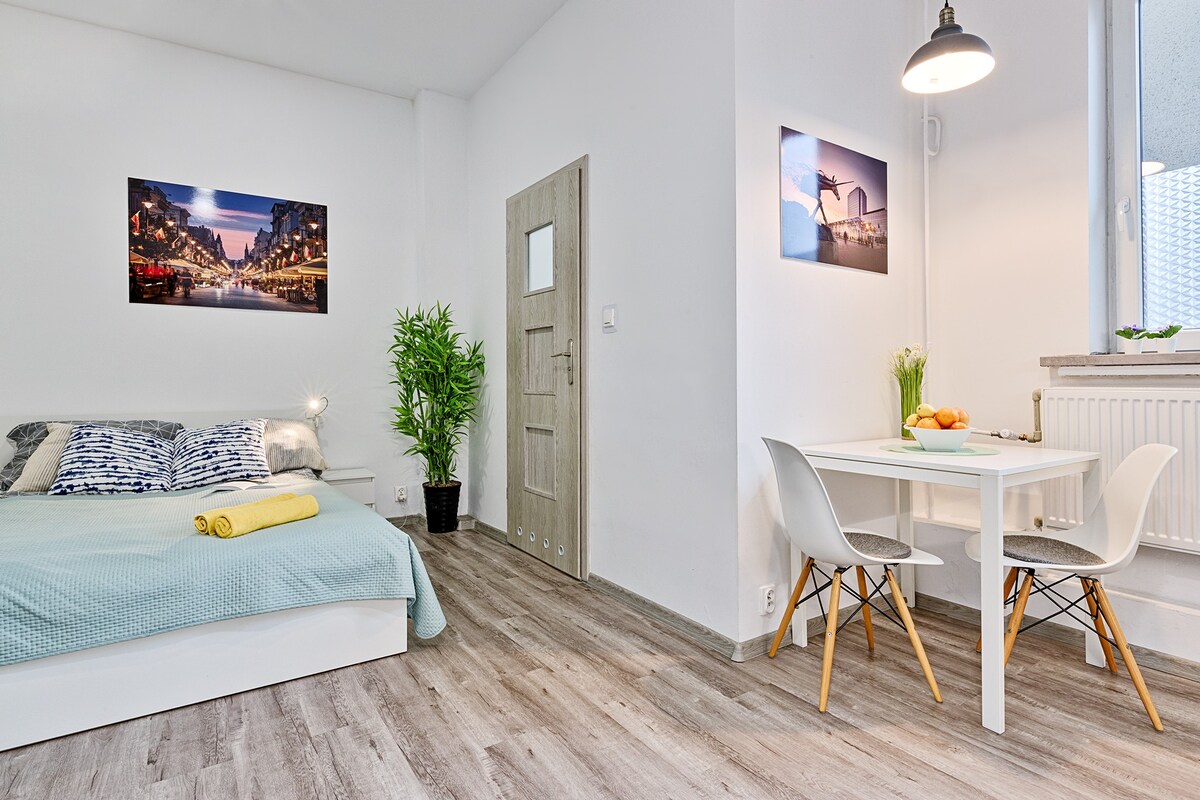 Jasny apartament idealnie nadaje się dla jednej osoby ale jest na tyle przestronne ze 2 osoby będą mogły również wygodnie odpocząć, łóżko rozkładane do 180x200. Lokalizacja jest dobra jako punkt wypadowy do centrum. Uwaga: Lokal jest dyzenfekowany oraz ozonowany po każdym pobycie.
