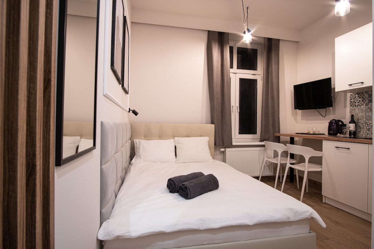 W apartamencie znajduje się duża i wygodna sypialnia z łóżkiem o wielkości king size. Ale to nie wszystko - tuż obok łóżka stoi elegancka, wolnostojąca wanna, która pozwoli na relaks i odpoczynek po dniu pełnym wrażeń. To doskonałe miejsce dla par, które pragną spędzić romantyczny weekend w Łodzi. Wszystko to sprawia, że pobyt w luksusowym apartamencie z antresolą na Piotrkowskiej w Łodzi będzie niezapomnianym doświadczeniem dla każdego, kto ceni sobie komfort, elegancję i styl.