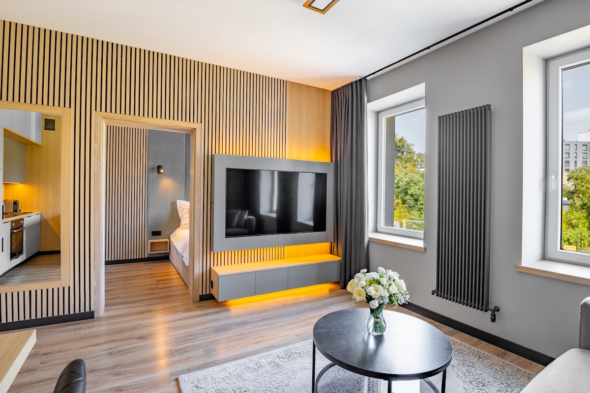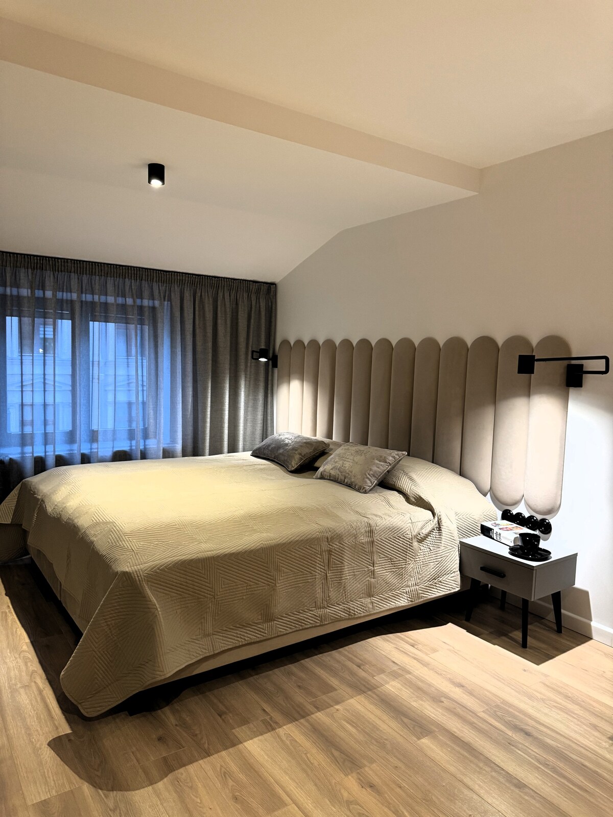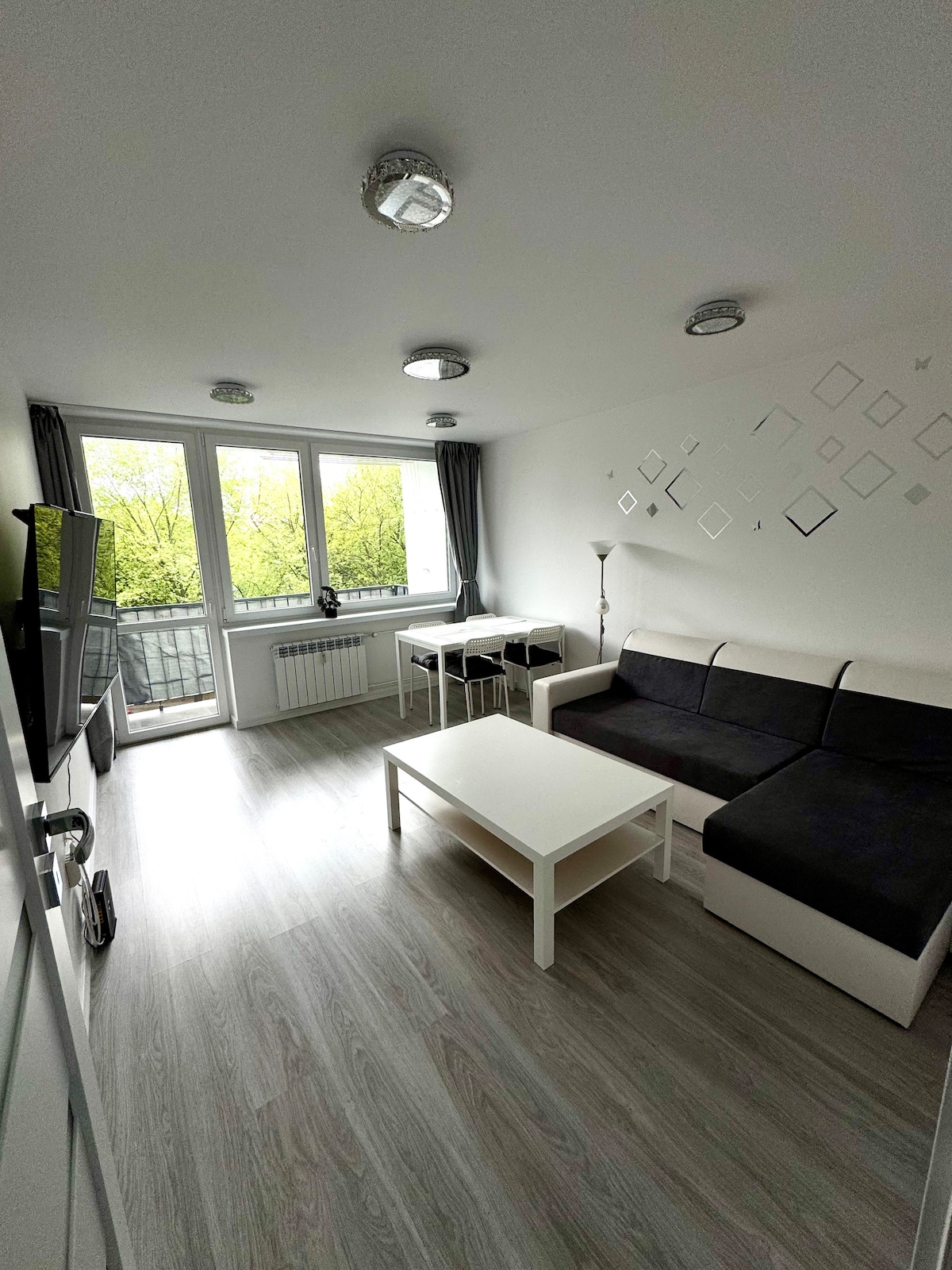 This modernly finished and furnished apartment is located in secured compound in the heart of the city of Lodz. Spacey living room with comfortable sofa, table and 4 chairs, TV cabinet and 55" TV with Play Station for with games as in the photo and with apps like Netflix, Apple Tv, Max, Prime is connected to fully equipped kitchen. Main bedroom queen size bed. Spare bedroom- double bed. One parking spot is dedicated for you, inside the secured area, next to the building.