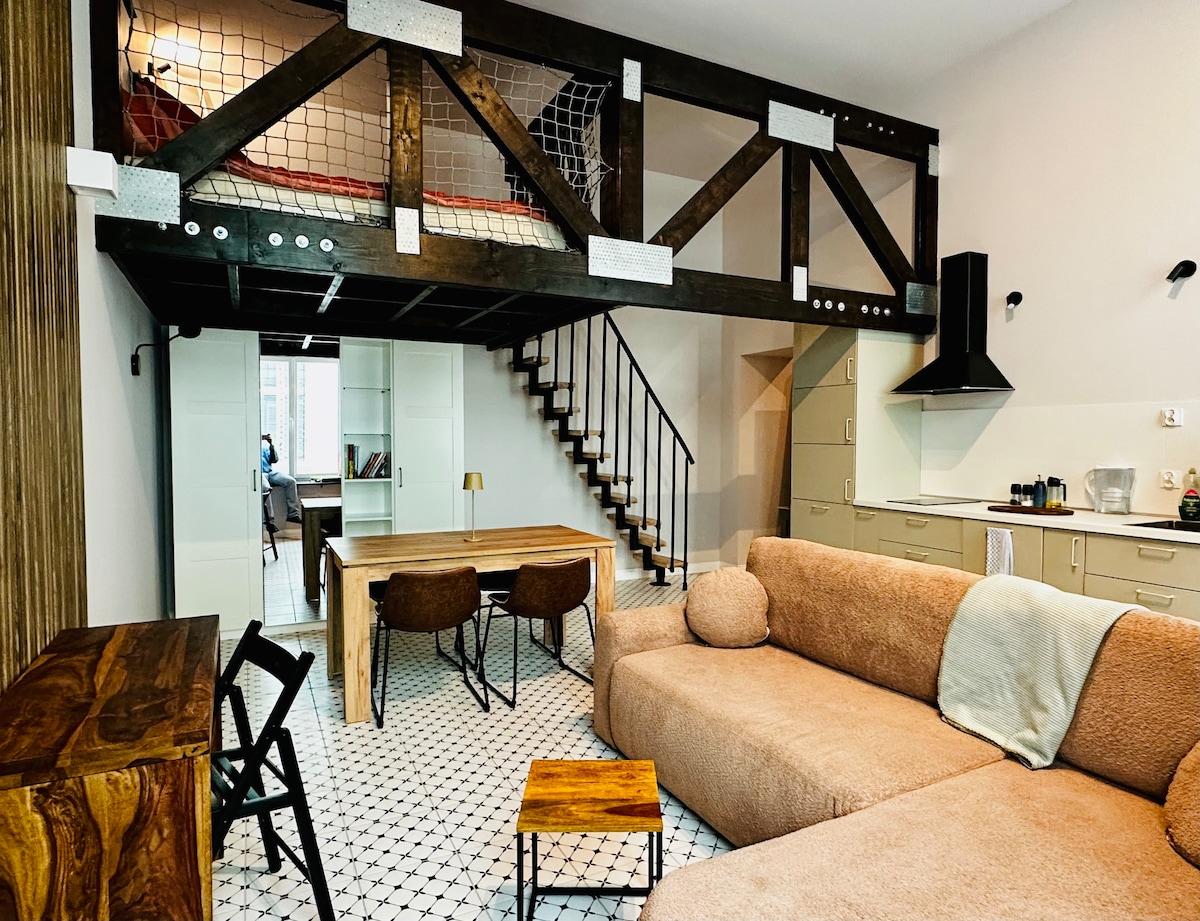 Stylowy apartament typu studio idealnie nadający się na nocleg w samym sercu Łodzi. Oddalony 1 km od ulicy Piotrkowskiej - słynnego łódzkiego deptaka. Dzięki sejfom na klucze zameldowania i wymeldowania odbywają się w prosty, samodzielny i szybki sposób. Do dyspozycji gości rozkładana kanapa oraz sypialniana antresola. Apartament znajduje się w oficynie zrewitalizowanej łódzkiej kamienicy. Posiada on w pełni wyposażoną kuchnię oraz wszelkie niezbędne środki czystości i udogodnienia.