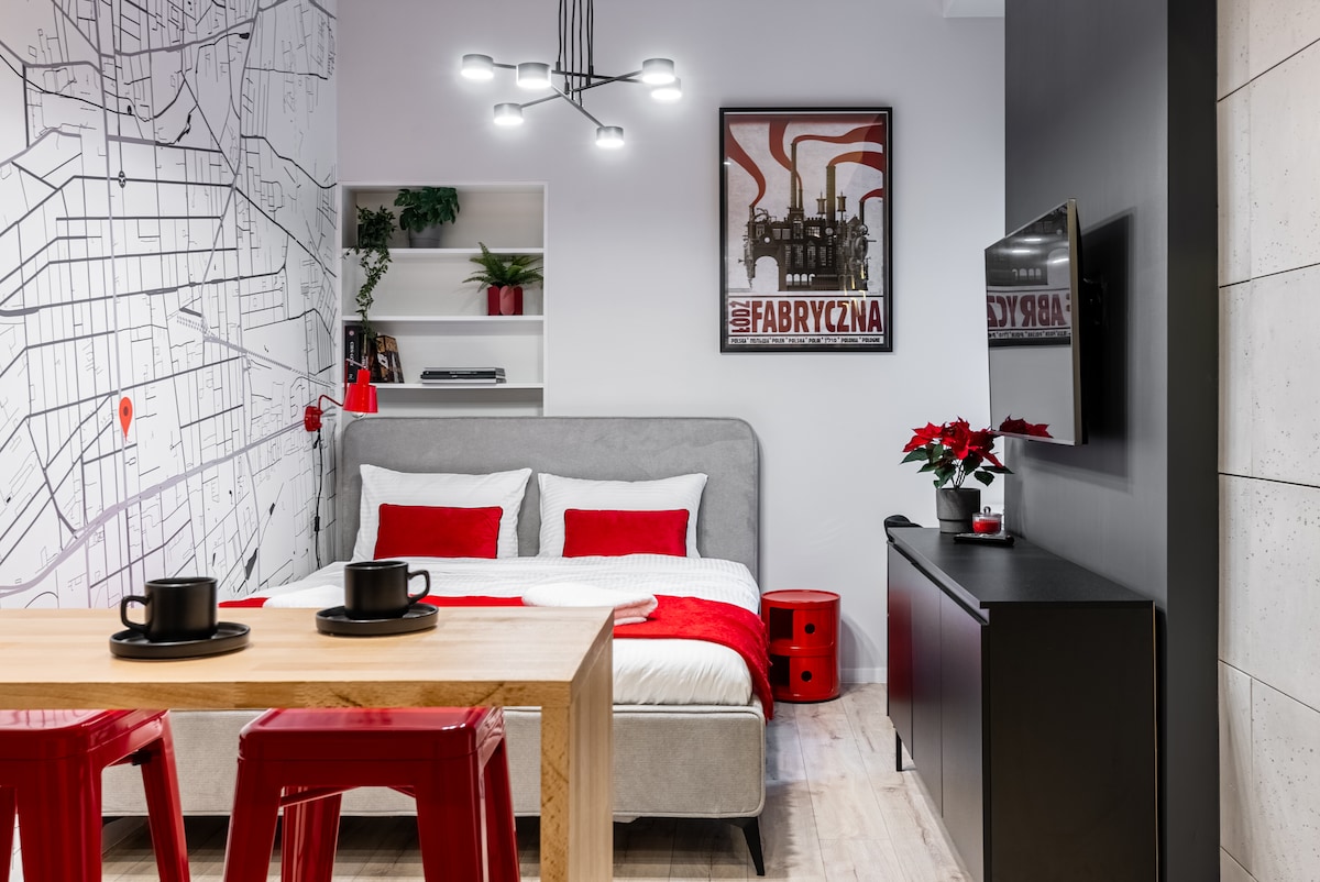 Mieszkanie w Łodzi przy ul. Sienkiewicza położone na 3 piętrze, składa się z przestronnego salonu z aneksem kuchennym, sypialni z wygodnym miejscem do pracy i łazienki o łącznej pow. około 49 m2 i wysokości 3,7 m. Mieszkanie nowe, w pełni wykończone elementami wysokiej jakości i posiadające pełne wyposażenie (naczynia, sztućce, pościel, ręczniki i elementy ozdobne).