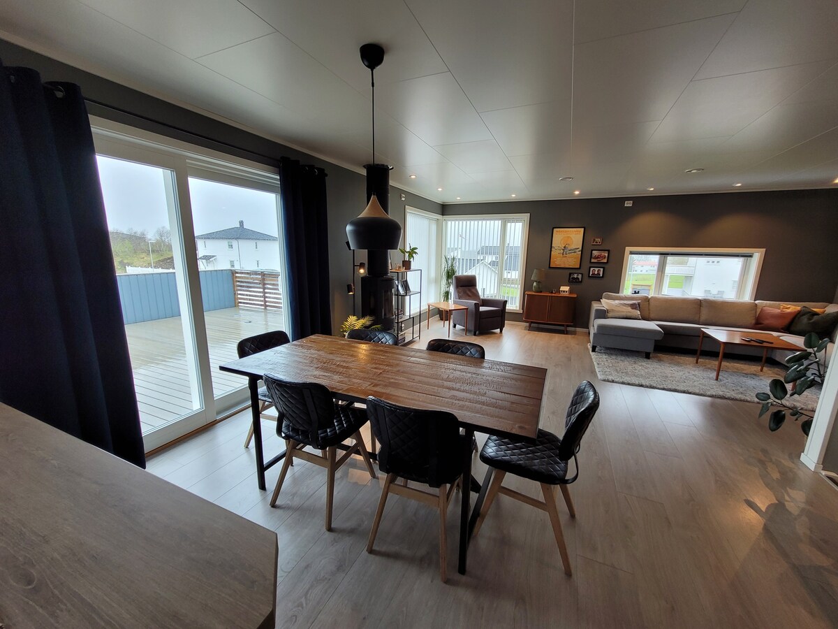 I vårt familiehjem kan voksne eller familier bo i et rolig nabolag nært Leknes sentrum (2 km) og midt i Lofoten. Huset har tre terrasser og en trampoline som kan brukes. Tre soverom med hver sine dobbelsenger, samt mulighet for madrass på gulv. Vi har mange brettspill, dvd/netflix, gitar og keyboard, så om været er dårlig kan dere nyte en hyggelig innekveld.