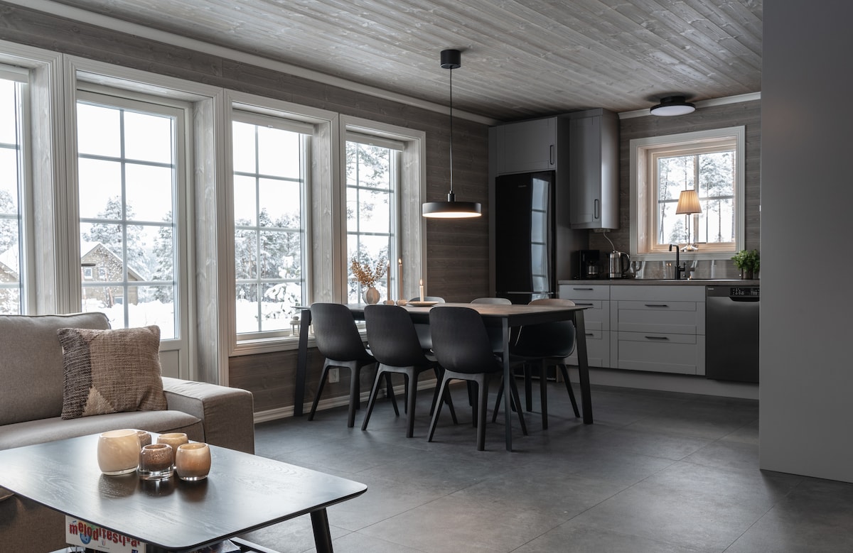 Magisk lodge i lugnt läge nära vandringsleder och med glidavstånd till skidåkning i både backar och spår. Efter en dag uppe på fjällen kan ni komma in för att basta, gosa ner i soffan vid öppna spisen eller njut av en middag runt det stora middagsbordet framför glasväggarna som ramar in fjällmiljön likt en stor tavla. Lodgen ligger nära Storhogna M där det finns restaurang, skiduthyrning, självbetjänande matbutik och bowling. 2 km bort finns högfjällshotellet med spa och fler restauranger.