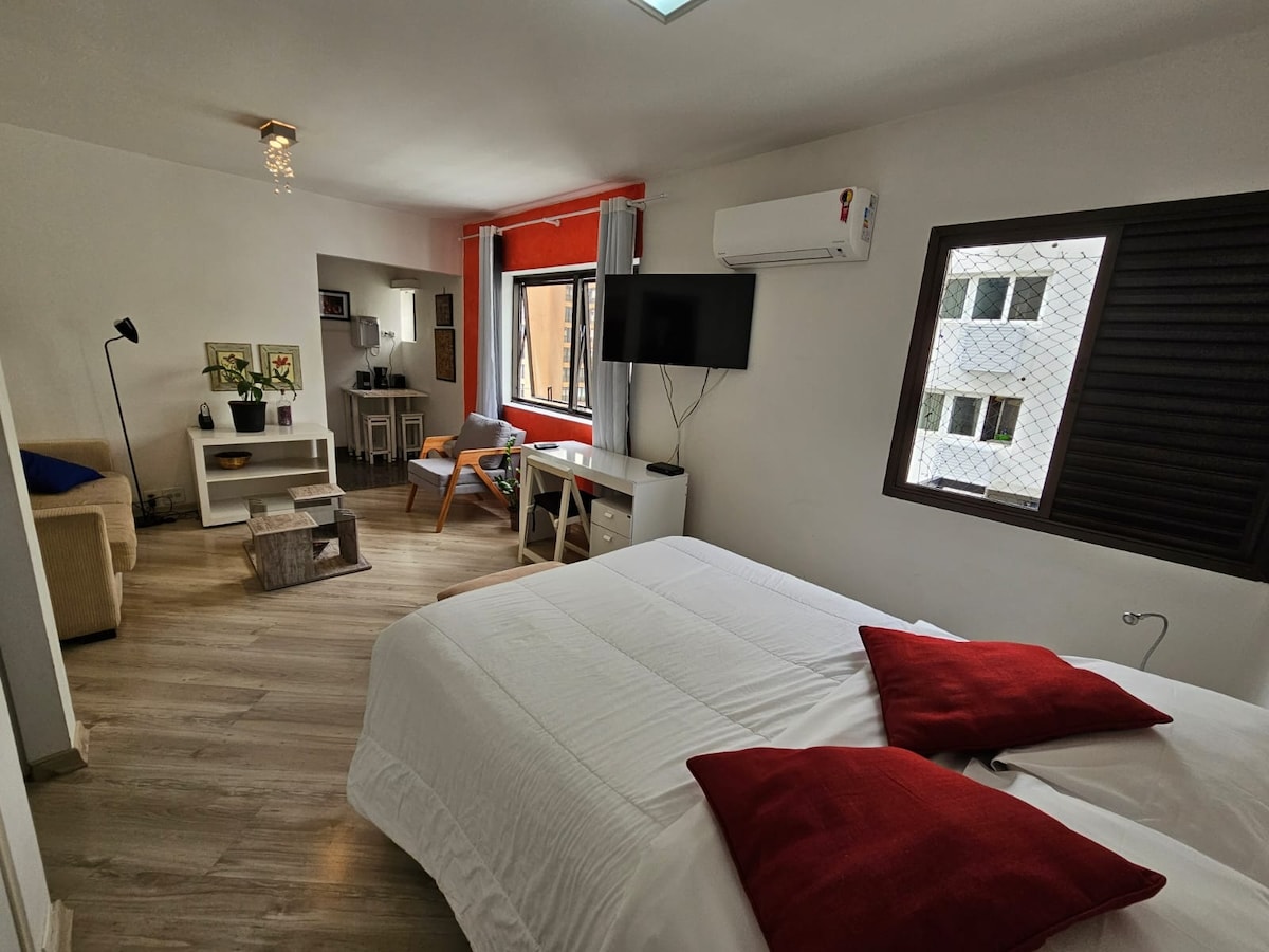 Studio novo e aconchegante no coração de São Paulo, prédio recém entregue com tudo novo! Cama de casal, cortina blackout, secador de cabelo, airfryer, panela de arroz, máquina de café e todos os utensílios necessários para uma ótima e confortável hospedagem. Prédio super bem localizado, 5min a pé da Avenida Paulista/ muito próximo aos metrôs da Avenida Paulista e Consolação. Pets são muito bem-vindos :)