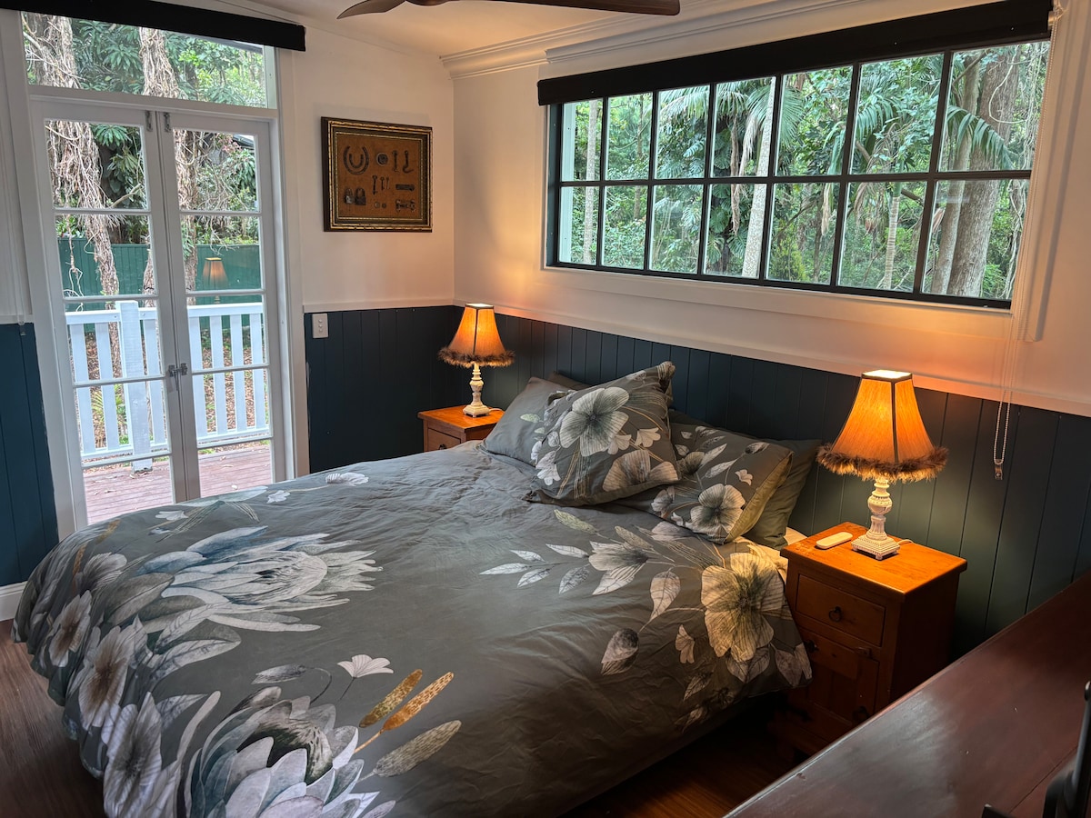 Experience tranquility in a beautifully appointed chapel nestled in the Gold Coast Hinterland. Relax on a romantic swing overlooking the pond and watch the stunning sunset. Cozy up by the fire or unwind with a soak in the claw bath . The mezzanine boasts a queen-sized bed and a single daybed with trundle, while the second bedroom offers flexible bedding arrangements, including a king-sized bed or two singles; please specify your preference. Additional rollaway beds and port a cot are available