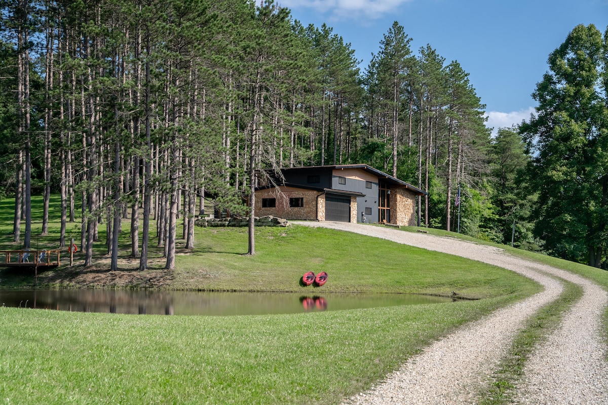Find peace and solitude at Red Pine Ridge. This spacious retreat is seated on top of a secluded hillside, surrounded by tall, beautiful pine trees. Guests of all ages will be drawn outdoors to enjoy the 5-acre property. The large pond is ready for adventures, while the outdoor fire pit and hot tub provide a cozy experience in all seasons. Nighttime stargazing is unparalleled. This modern and comfortable home provides a great place for entertainment, conversation and relaxation.