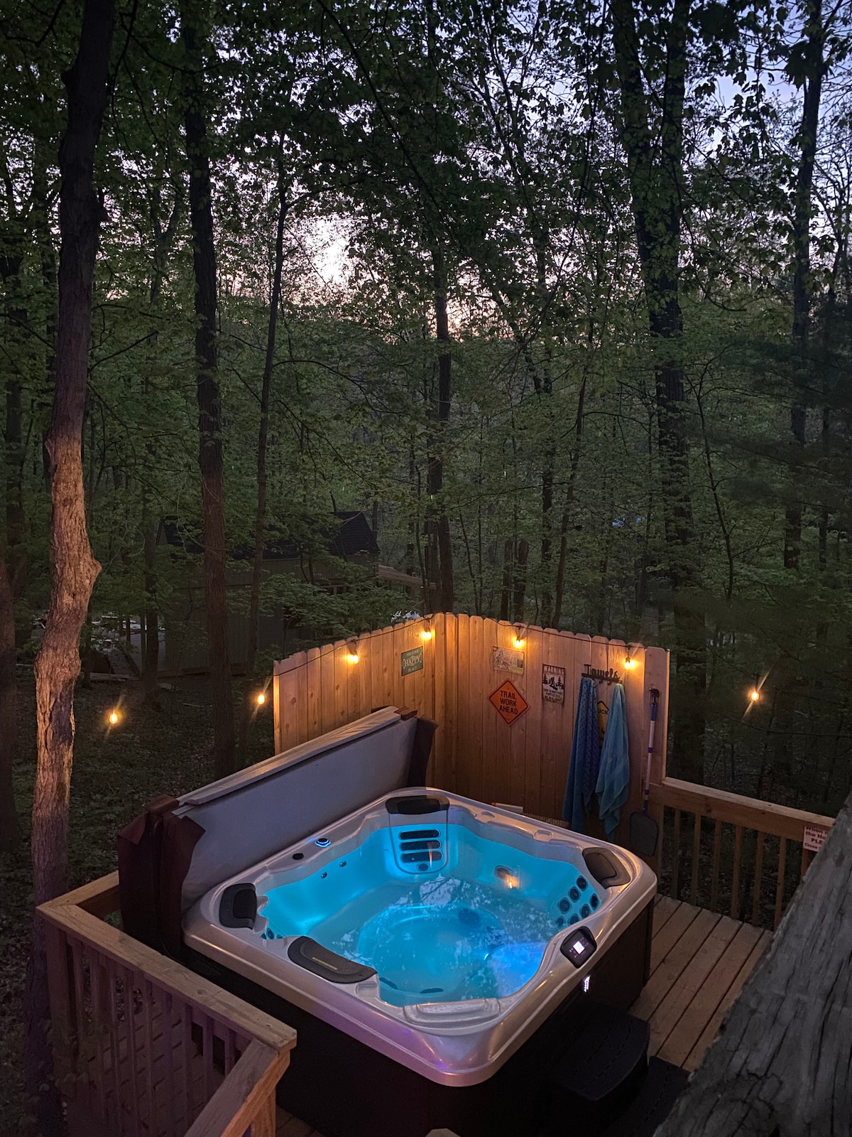 The Ultimate Adventure! Located in the breathtaking Hocking Hills, only 40 minutes from downtown Columbus, the Rustic Treehouse is your destination for complete relaxation, or exploration of nature! Private parking, blazing fast WIFI, a HUGE 100-inch projection screen with views from your suspended net or queen bed to stream all your favorite programs and movies, and many more amenities! Below deck enjoy a 7 person hot tub, swinging bench overlooking the trees, and a fire pit!