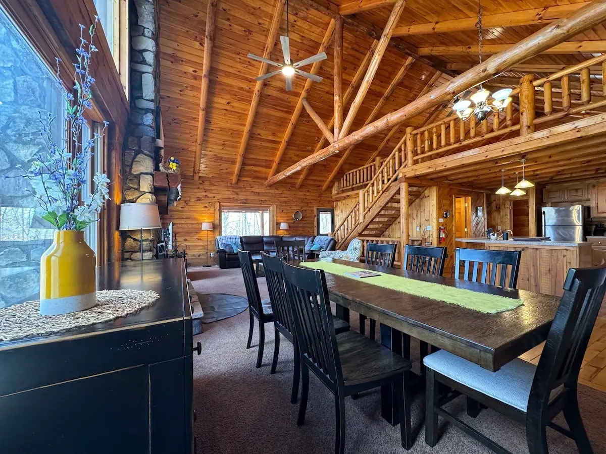 Forget your worries in this spacious and serene space. Come enjoy this cabin centrally located on 90 acres, sitting back on a beautiful stocked pond! Updated in 2021, this is a beautiful place to come and enjoy nature, with all the amenities. You can have breakfast on an upstairs balcony while watching ducks and wild game around the pond. The unique feeling of being tucked away in the hemlock trees just really sets the mood at this unique cabin.