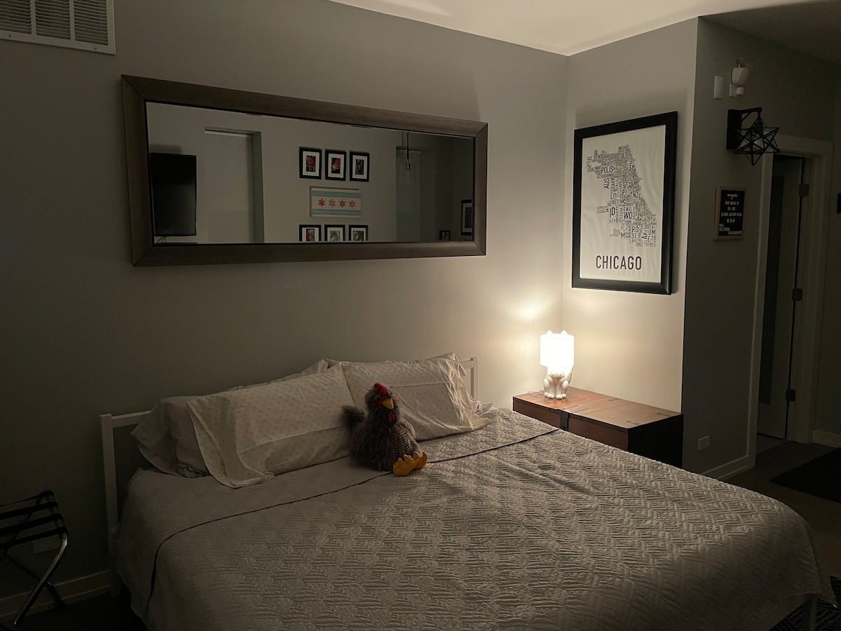 Cozy English garden apt (300 sq ft) w/ priv. entrance & free offstreet prking. 4 min walk to Blue Line. Brightly lit / high ceiling. Adjustable Tempupedic memory foam QUEEN bed plus futon in lvng rm. Kitchenette w/ mini-frig, Nespresso & Keurig, toastr ovn, microwv, and waffle maker w/maple syrp. Designer bath. 30+ restaur/bar nearby (see GUIDE BK in LOCATION). Self check-in. Flexible cancel. Early lugg. drop. A space to unwind in -- art-filled and artistic in design, NOT bland or IKEA like!