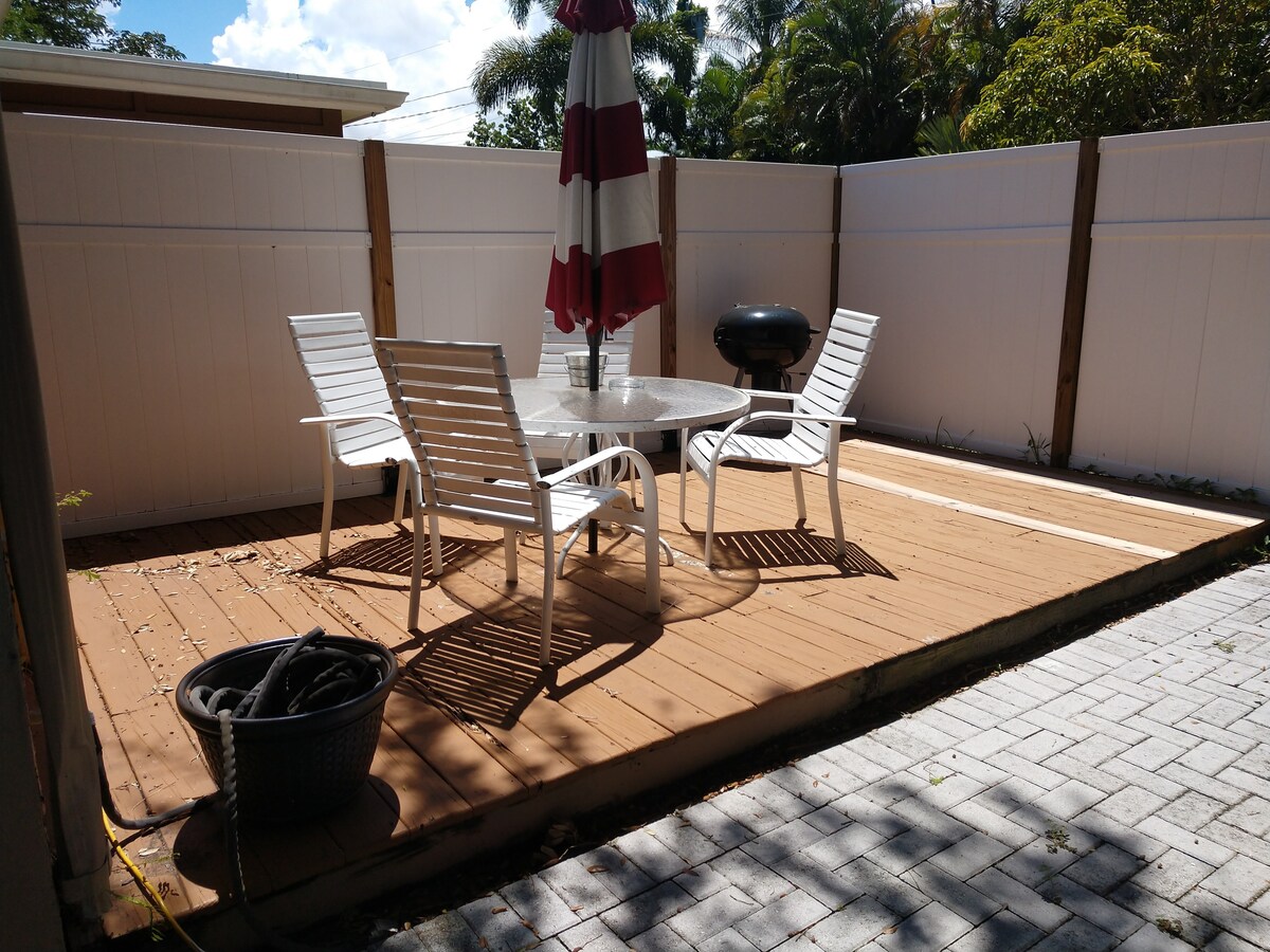 Stay in our private studio guest suite! Queen bed, full size pullout couch, PRIVATE FULL BATH, Kitchen, private entry, parking & private patio with grill and outdoor seating. Roku smart TV. 5 minute drive to BREAKFAST, RESTAURANTS, GROCERY, MALL. Just 5 minute drive to ROGER DEAN STADIUM Home of the St. Louis Cardinals & Miami Marlins Spring Training! 5 Minute drive to Ocean Beaches, & QUICK ACCESS I-95. Beach chairs,towels, and cooler available.