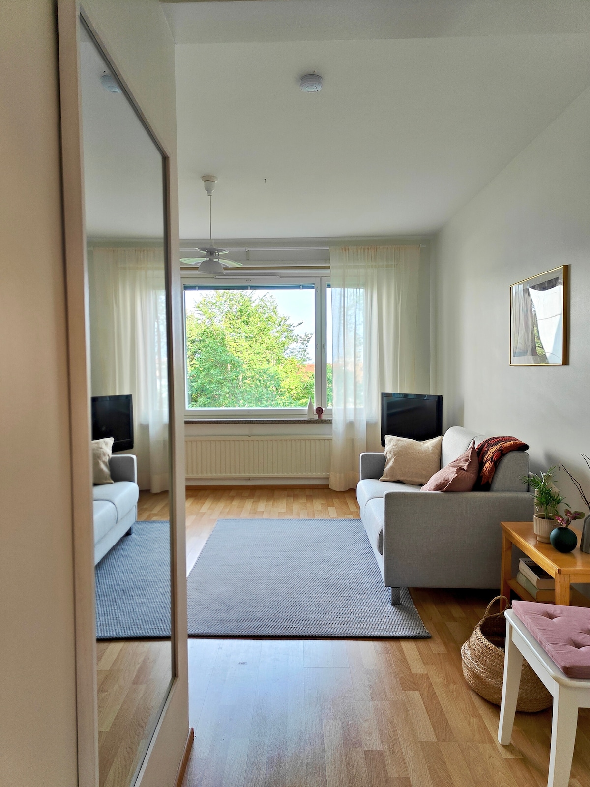 An apartment that is like a cosy nest in the city centre. Lovely, characteristic neighbourhood with beautiful, old buildings. 5-10 minutes to the market square and the railway station, bus station and Logomo. Windows towards the garden and a park, so no traffic noise. Bathroom renovated 12/2018. Old, charming, art nouveau building.