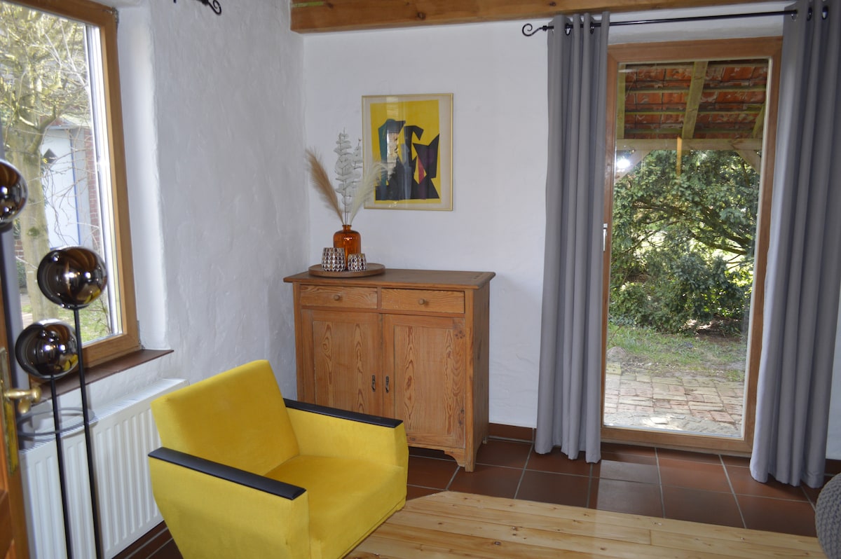 Auf unserem Hof findest du alles für ruhige Tage auf dem Land. Es gibt einen Bio-Dorfladen mit Café, eine Fasssauna und die Natur direkt vor der Tür. Viermal wöchentlich finden Yogakurse statt – ideal, um Körper und Geist zu stärken. Ein Parkplatz und eine E-Tankstelle sind vorhanden. Wir sind ein 4-Generationen-Hof mit nachhaltigen Projekten, darunter ein entstehender Permakulturgarten vor der Ferienwohnung. Die Wohnung ist ideal für Paare, ein Kinderbett stellen wir gern bereit.