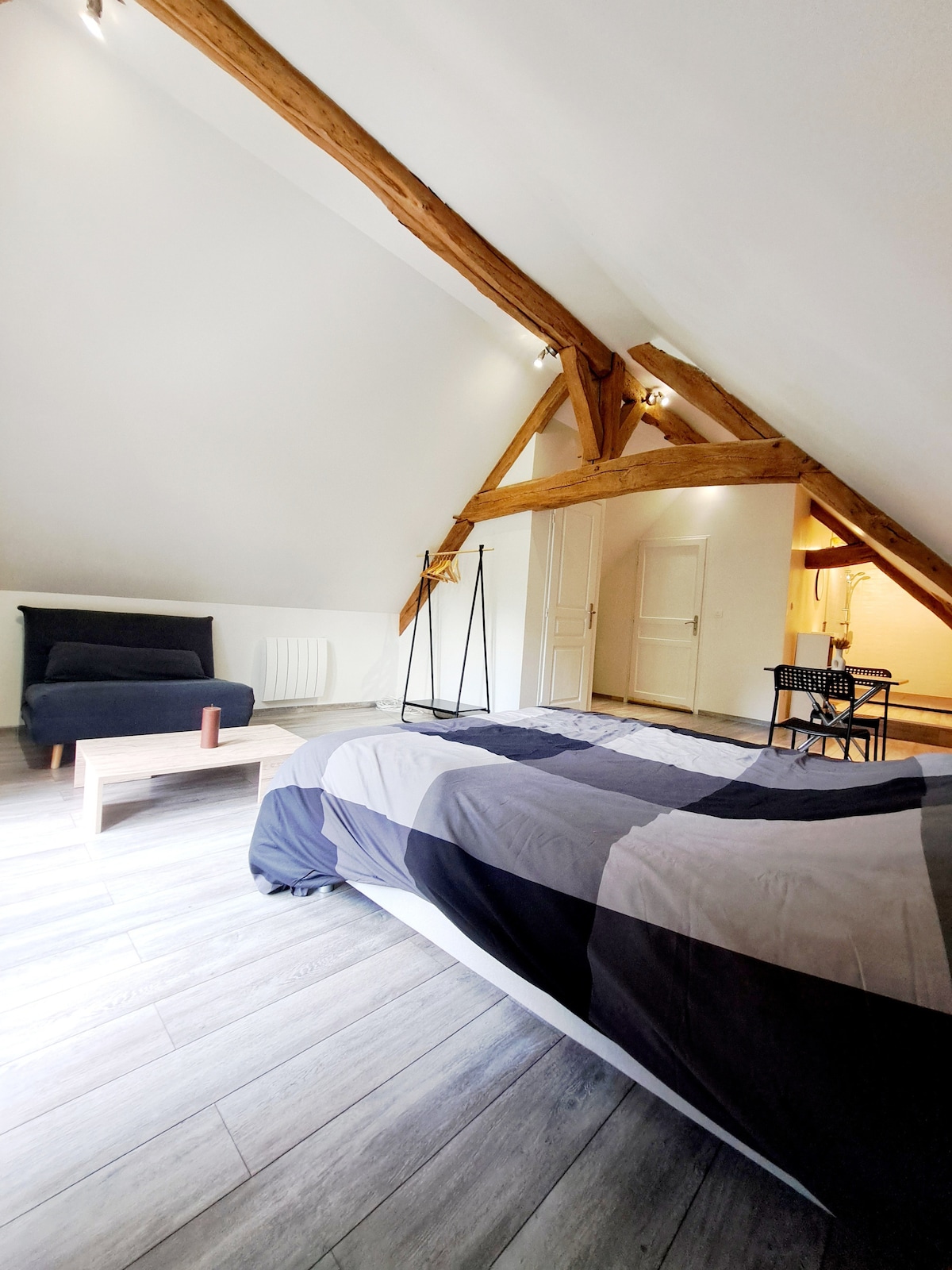 Classé *** . Loft aménagé dans grange indépendante restaurée, cour carrée composée de trois bâtiments, parking et ouverture sur jardin entièrement indépendante, à 15' de Lamotte-Beuvron et 30' de Chambord. Appartement-loft de 60m2 (la chambre est dans une alcôve séparée du salon par un double-rideaux occultant) à bois. Entrée et parking indépendants, jardin privatif, salon jardin et BBQ. Meublé non spécifiquement adapté aux personnes en situation de handicap.