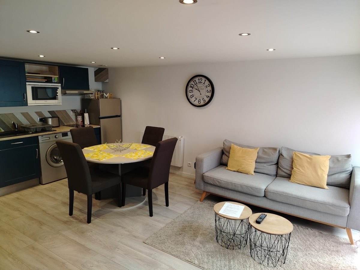 Maison de centre ville de plain pied de 50m2 avec entrée privée. Une grande pièce de vie avec cuisine ouverte et entièrement équipée (frigo, micro ondes, cafetière, bouilloire, plaque induction, grille pain, plancha), canapé lit 2 places ( 140) ou 2 lits d'appoint (90x190), espace TV et salon. 1 chambre avec un lit double (140) Salle d'eau, WC privé séparé Parking privé Espace extérieur avec salon de jardin Draps ,couettes ,oreillers ...sont fournis. Prévoir votre nécessaire de toilette.