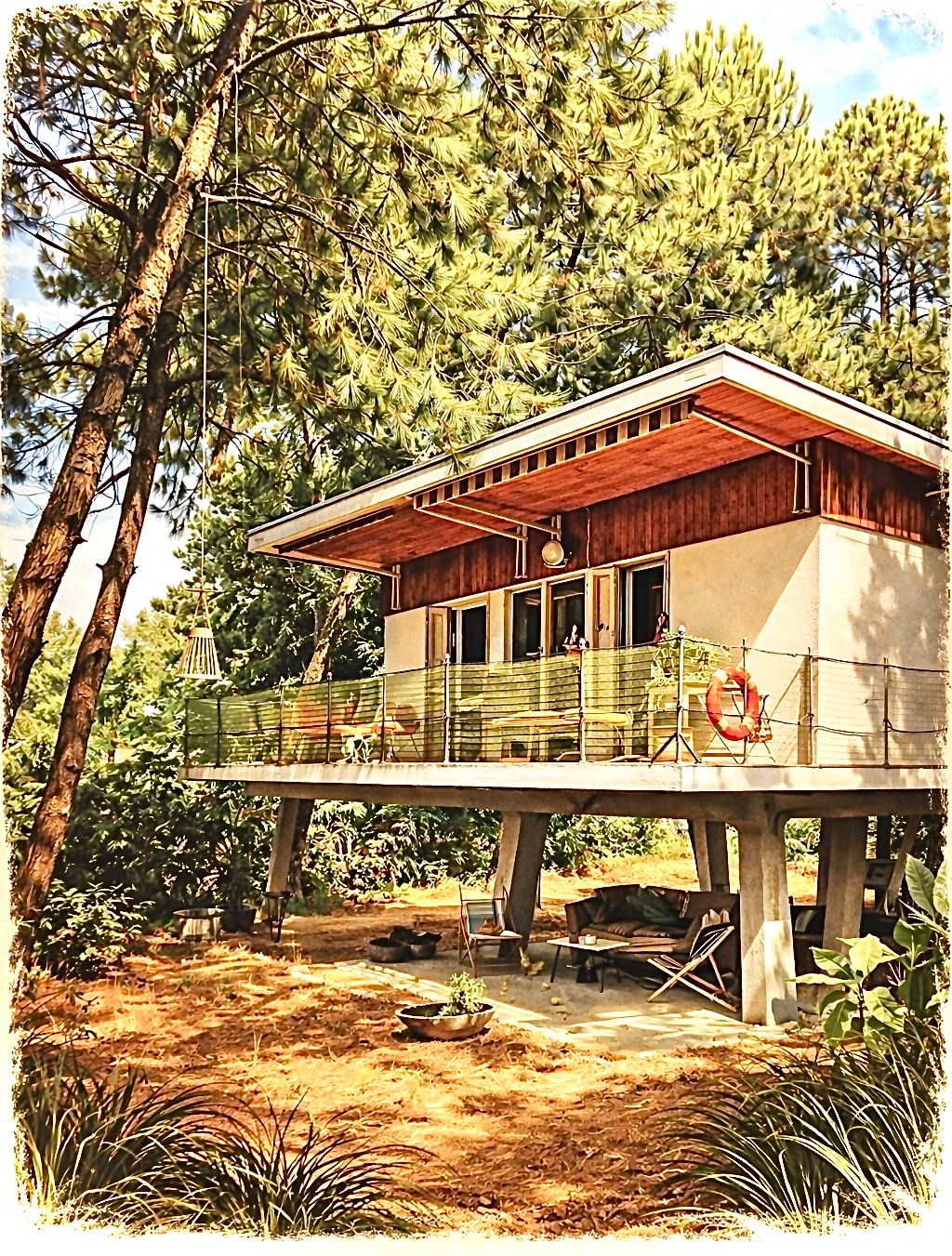 非典型的50年代别墅,位于森林和海滩之间的支柱上