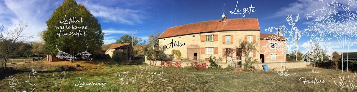 Gîte d'étape et de groupe. Gîte cycliste. ( La chambre peut-être partagée en période d'affluence. Possibilité de la privatisée selon conditions). Réservation une nuit dans chambre avec salle de bain 4 à 6 personnes grâce à deux lits gigognes, 20 € par personne. (Draps en supplément 5,50 €). Restauration possible sur place. (Petit déj' et repas) Kitchenette ou barbecue à disposition. Matériel bébé. Tarif enfant. A noter: le gîte n'est pas adapté aux réveillons en famille.