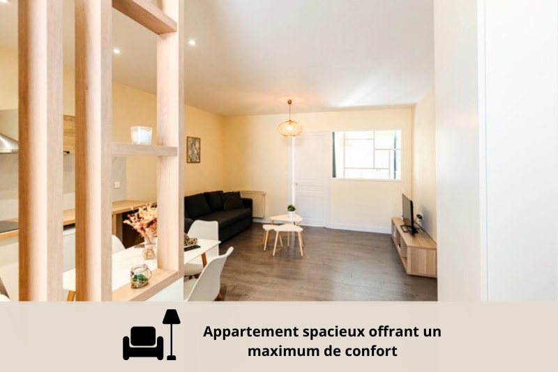 Appartement spacieux ,proche commerces 5mn à pieds Idéal pour une nuit ou un séjour afin d apprécier les activités aux alentours Situé dans une bâtisse en pierres des années 1800 entièrement rénovée , confortable et climatisé. Une cuisine équipée , coin repas , espace de travail avec wifi Deux chambres canapé convertible Une salle de bain avec douche italienne Fer et table à repasser Le plus : possibilité d accès à l espace privatif : spa hammam sauna et soins esthétiques sur rdv