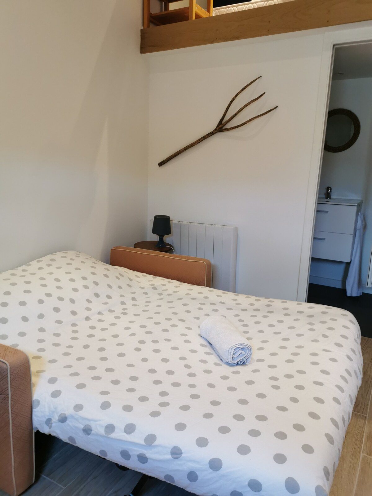 Superb accommodation new and furnished with care by an interior designer. Located about 25 minutes from Lyon, you will enjoy a stay cut off from the world in the countryside. This accommodation can accommodate 2 to 4 people, has its double bedroom in flexible (1 double bed) and an extra sleeping arrangement. Come and discover our region and its treasures (hikes, visits, discoveries of the land...).