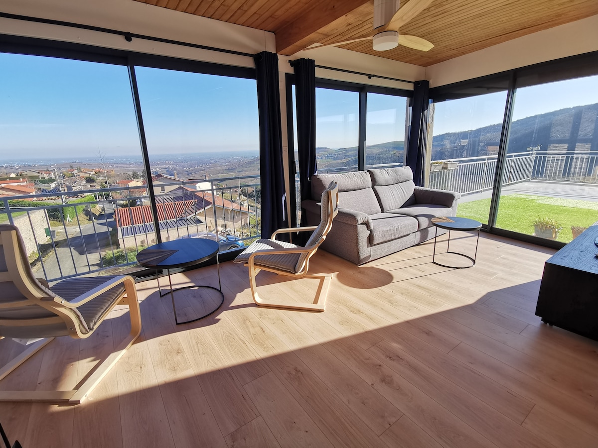 Au calme dans un Environnement verdoyant, avec vue imprenable, l'emplacement est idéal pour découvrir le Beaujolais . Départ direct pour les balades, les dégustations de vins, venez à la découverte de nos si beaux villages en Pierres Dorées. Nous pourrons vous conseiller avec plaisir . ⚠️il faut savoir que pour accéder au logement il y a un escalier extérieur en métal avec des marches en calbotis. A éviter si vous avez des problèmes de genoux ou si vos animaux ne descendent pas les marches .