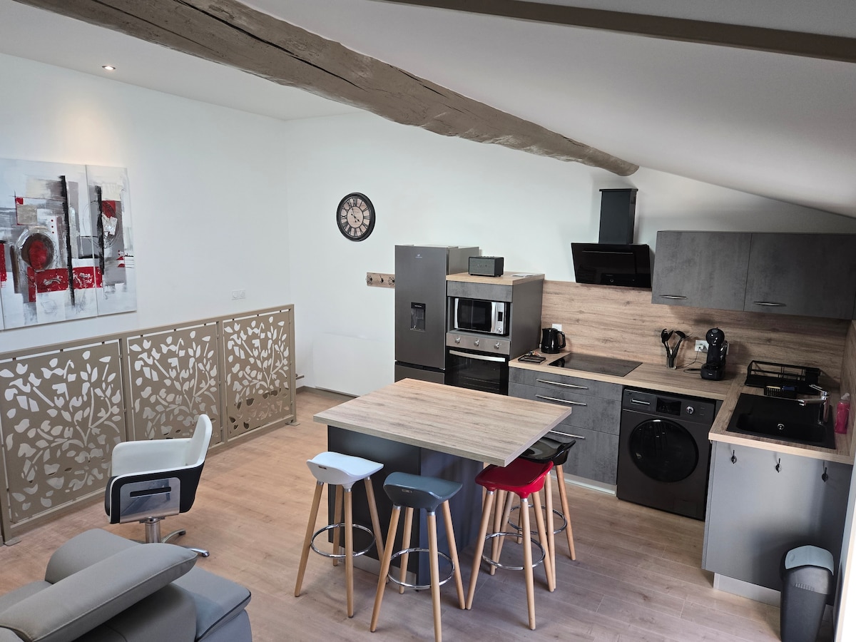 Appartement spacieux ,proche commerces 5mn à pieds Idéal pour une nuit ou un séjour afin d apprécier les activités aux alentours Situé dans une bâtisse en pierres des années 1800 entièrement rénovée , confortable et climatisé. Une cuisine équipée , coin repas , espace de travail avec wifi Deux chambres canapé convertible Une salle de bain avec douche italienne Fer et table à repasser Le plus : possibilité d accès à l espace privatif : spa hammam sauna et soins esthétiques sur rdv