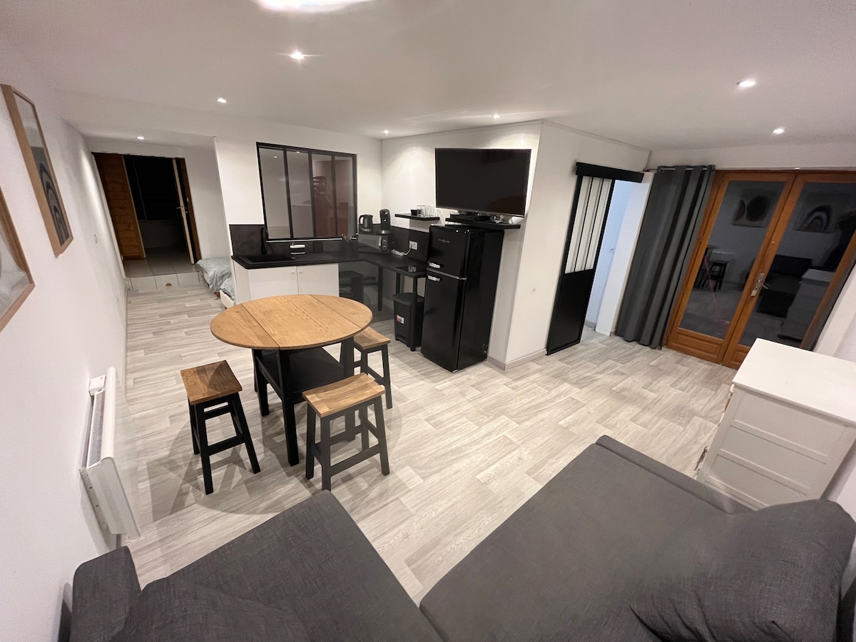 Plongez dans l’univers d’Avatar ✨. Studio immersif avec jungle suspendue, lumières tamisées et déco unique 🌿. Profitez du lit sous la canopée avec TV 55’’ 📺, d’une baignoire balnéo privative avec jets hydromassants 💦 et d’une table de massage pour un moment détente 💆. Séjour cocooning idéal pour un instant romantique ou relaxant, avec cuisine équipée et accès à pied aux commerces et restaurants du centre-ville 🍴.