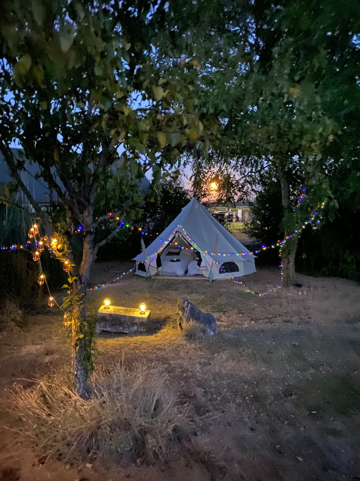 Our Safari Tent is nestled in the woods of the Loire Valley. It is equipped with all modern amenities for a touch of comfort under canvas. The Safari Lodge is fully self-sufficient, with a master bedroom leading to an ensuite with a full jet shower and conventional toilet. An open-plan kitchen, diner, living room, fully filled with all cooking equipment and crockery. Towels, hairdryer, bath robes all included. Guests can relax in their private spa hot tub or in the beautiful communal gardens