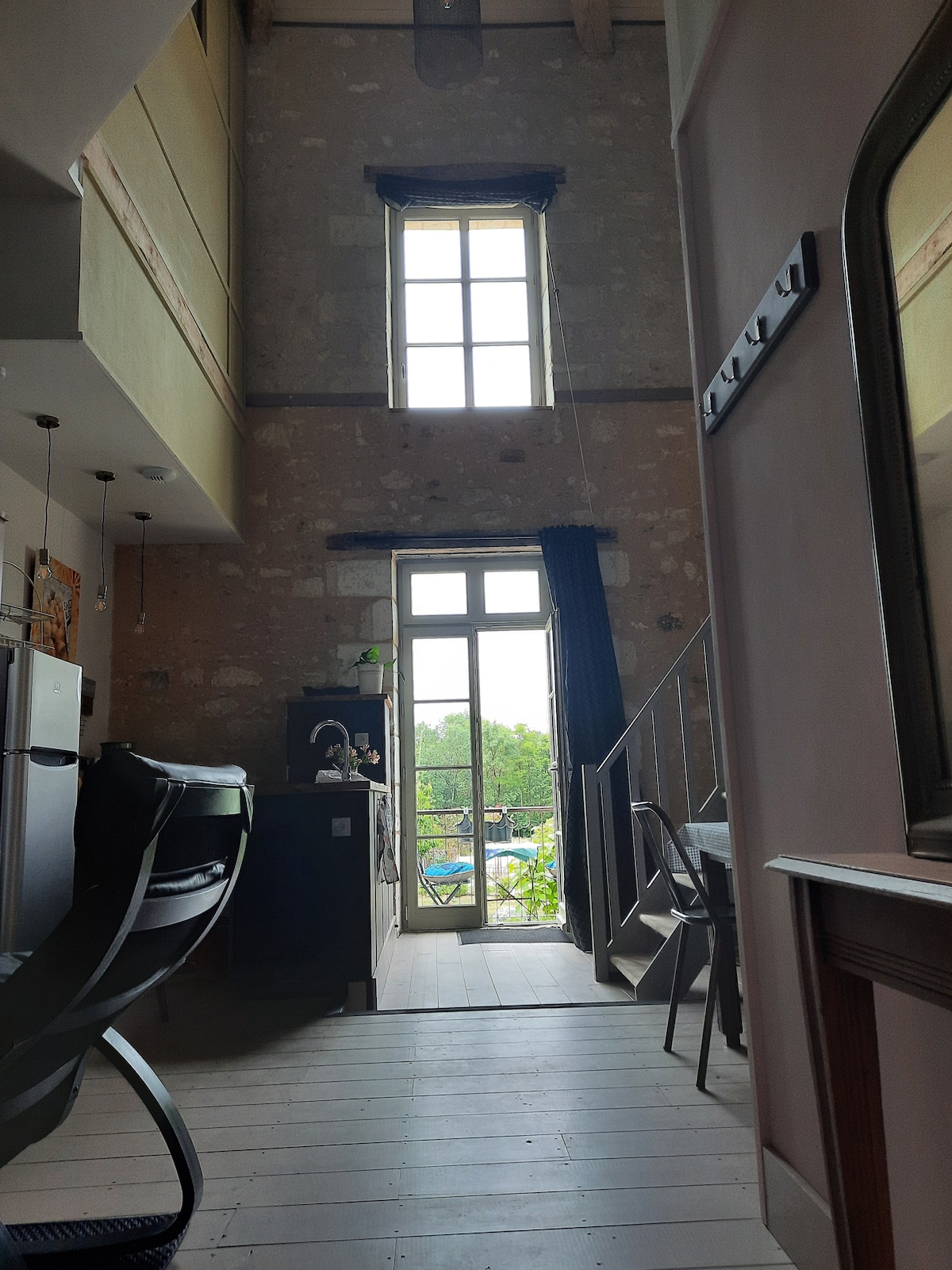 Loft neuf dans un moulin surplombant le Loir avec vue exceptionnelle Pour deux personnes, logement confortable, bien équipé, literie et ameublements neufs Cuisine ouverte, poêle à bois Grande terrasse donnant sur le Loir Accès privé à la rivière, au déversoir Possibilité de pêche, baignade, pédalo sous l'entière responsabilité des locataires Borne de recharge publique à proximité
