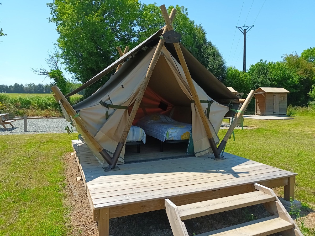 La tente charme est spacieuse et équipée de deux lits doubles ainsi que de 2 chauffeuses au besoin En plus de cette tente, vous aurez accès à tous les équipements du Camping la Viotterie : - Sanitaire commun (toilette, douche et machine à laver) - Cuisine commune (plaque de cuisson, frigo, vaisselle,....) -Piscine chauffée et espace jeux en été -Etang pêchable Le confort dans un vrai lit (vrai matelas, draps,...) dans un cadre verdoyant dedans/dehors, un très bon compromis !
