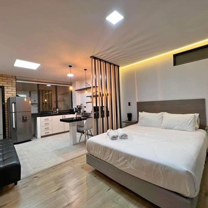 Disfruta de un departamento nuevo, privado y diseñado para ofrecer tranquilidad, seguridad y comodidad. Aquí encontrarás un espacio elegante, limpio y acogedor, con un dormitorio equipado con colchón de 2 plazas memory foam y un colchón auxiliar dentro del somier, duvet y almohadas ortopédicas para un descanso profundo. Además, 1 sofá cama de dos plazas muy cómodo con su ropa de cama completa. El parqueadero es techado y seguro, ideal para proteger tu auto del sol, lluvia y miradas externas.