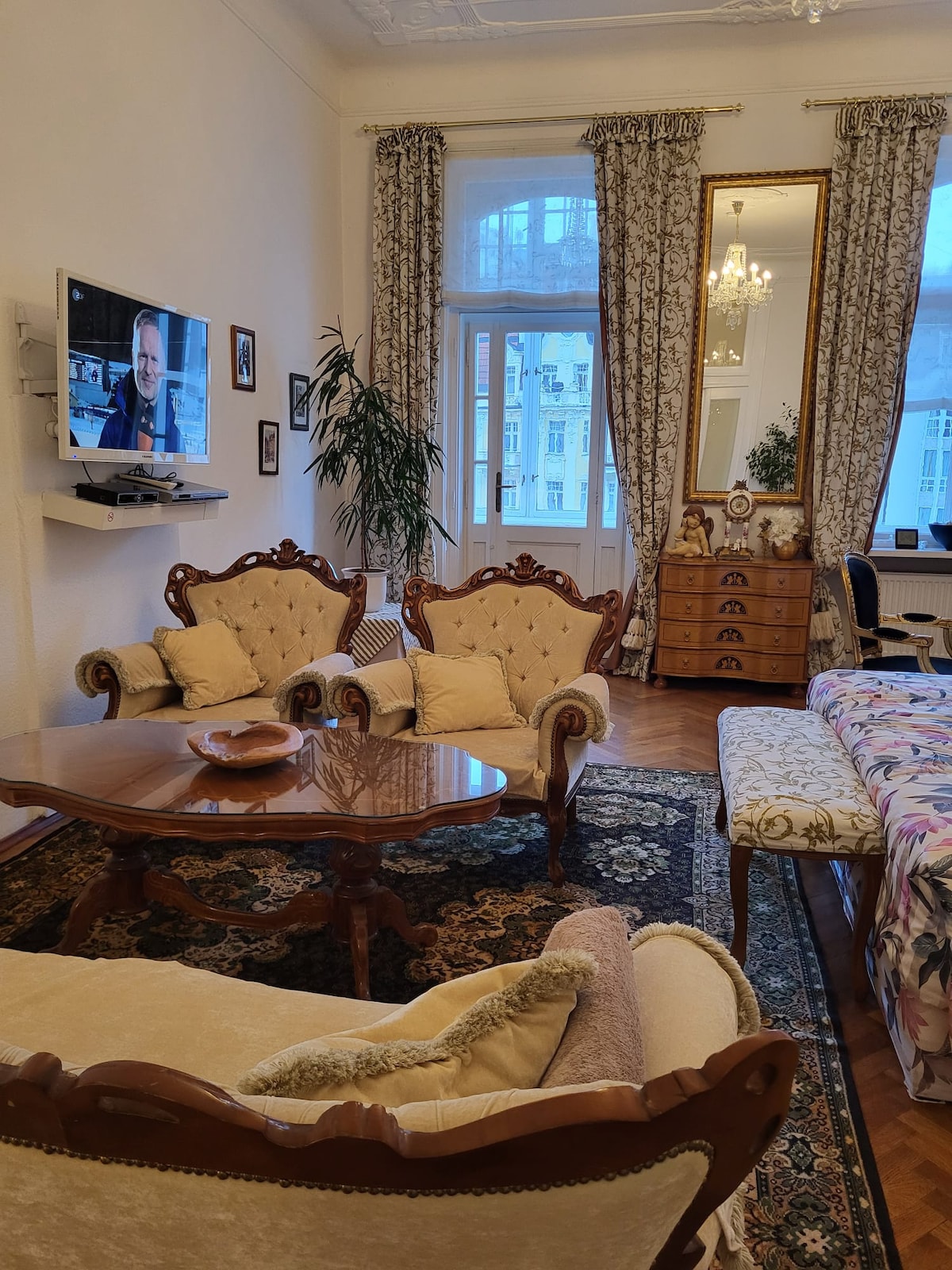 Stylish, sunny apartment of 100m2 at the best address in the center of Karlovy Vary, right across from GrandHotel Pupp. From the balcony you can watch the arrivals of movie stars and the events on the red carpet. It is a spacious flat with two bedrooms and its own children's room. The location is right on the spa colonnade next to the beautiful SPA and 20m from the bus stop, from where you can travel anywhere in the city. Available 2x new large TV 189 cm with activated Netflix, Amazon, HBO, SkyS