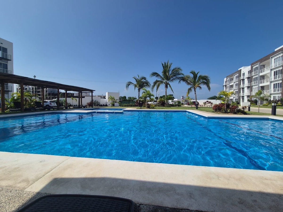 Departamento costero en condominio Punta Mar Diamante, ubicado a 10 minutos del aeropuerto y 2 minutos de la playa. Disfruta de un entorno tranquilo y seguro.