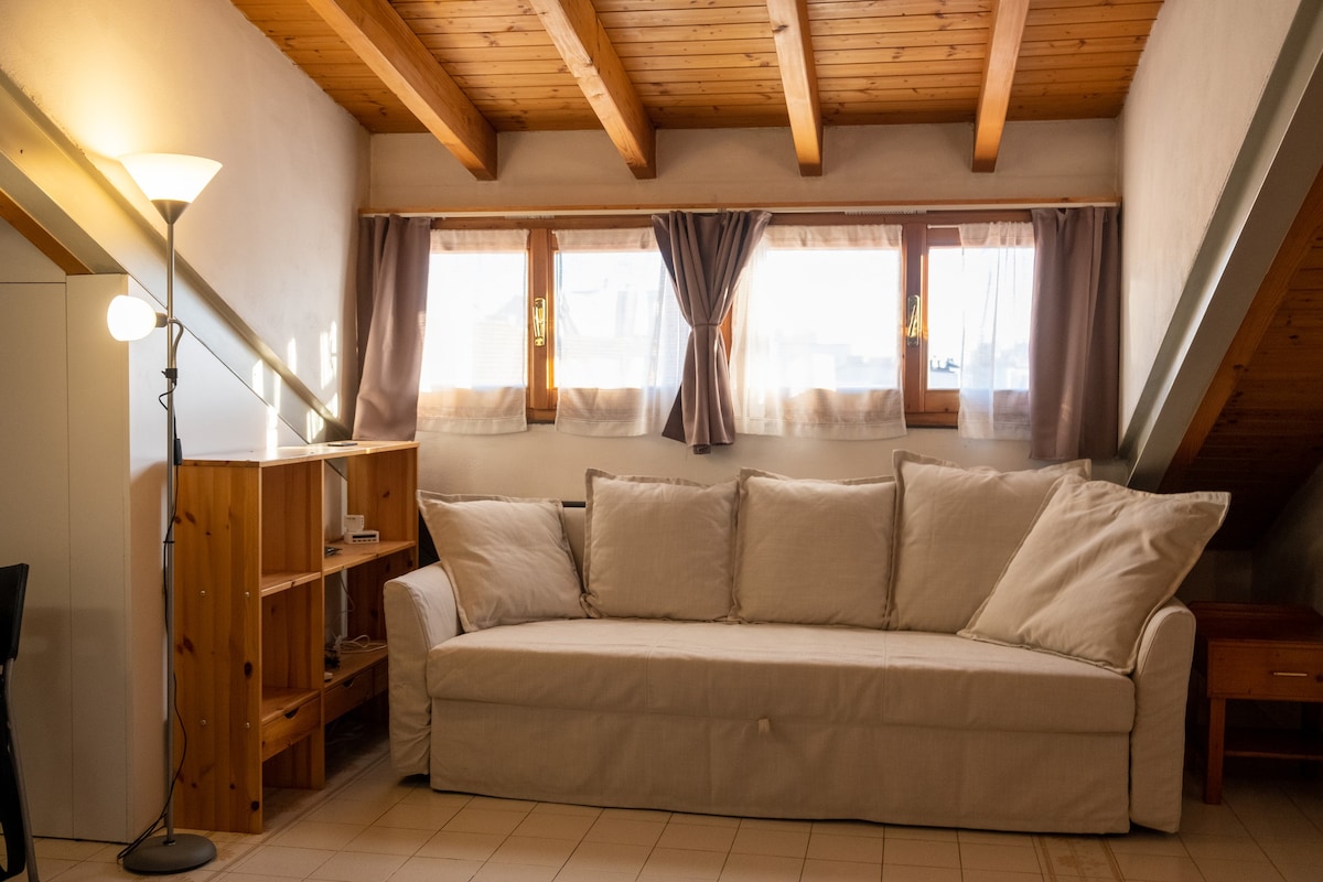 Attico immerso nel verde con vista su Milano. L'appartamento è situato all’ottavo e ultimo piano e si compone di un open space con cucina e divano letto matrimoniale (con due topper per garantire il miglior riposo possibile), camera da letto con letto matrimoniale e poltrona letto e un bagno. L'appartamento gode di una spettacolare vista panoramica sul Duomo e il centro città, che può essere apprezzato dalla bow window calpestabile sorseggiando un bicchiere di vino.