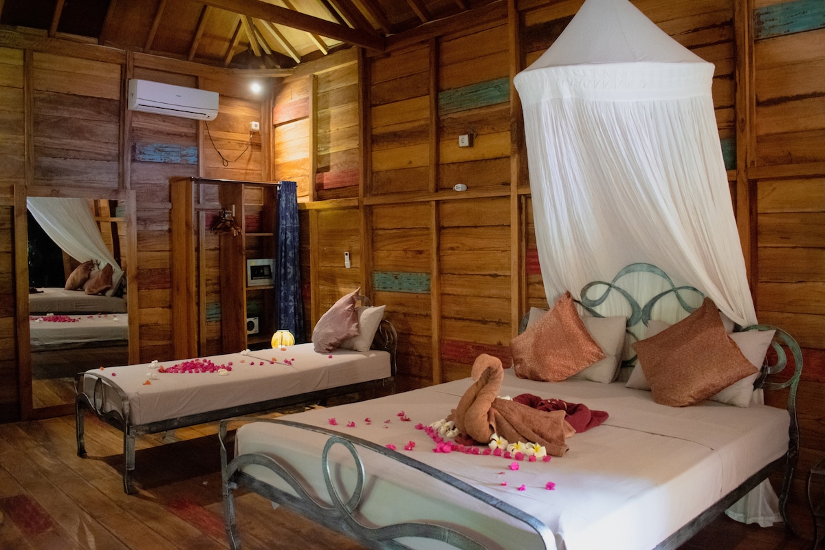 Shipwrecked paradise for bohemian wanderers and their little ones. Located on the north side of sunset boulevard you will find our hidden sanctuary. Breakfast, tea and coffee included daily. Our swimming pool is one of the largest pools in the Gilis and the bamboo movie/game room is perfect for the kids. The Deluxe room is perfect for travelers that want and need pure luxury King bed included with the option.