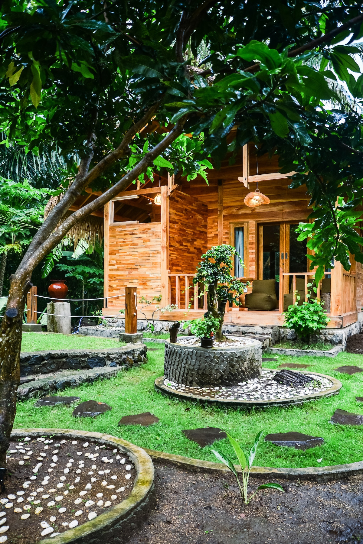 Traditional Lombok Style Family Bungalow ("Lumbung") on the Hillside. Quiet, Flourish & Green, Safe & Peaceful. Sustainable Large-Scale Estate under European Influence. 10 min drive to Bangsal Harbor (Hub Gili Islands, Bali, Komodo). 10 min drive to Lombok Wildlife Park. We are in the area of one of the largest Buddhist Temples, the surrounding area of Buddhist mountain villages with fantastic local life photography, also superb hiking possibilities. Motorbike rental available.