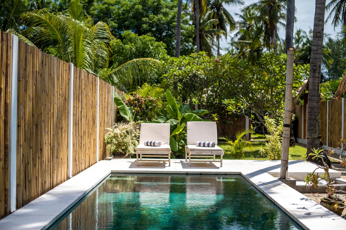 Escape to Breathe Villa Meno. A premium eco-villa for two, set among lush tropical gardens on the serene Island of Gili Meno. One of five private villas, it features air-conditioned rooms, ceiling fans, and a pool-view terrace. Designed with sustainable materials, the villa immerses guests in tropical tranquility, combining privacy, style, and easy access to pristine nearby beaches and reknowned snorkeling spots.