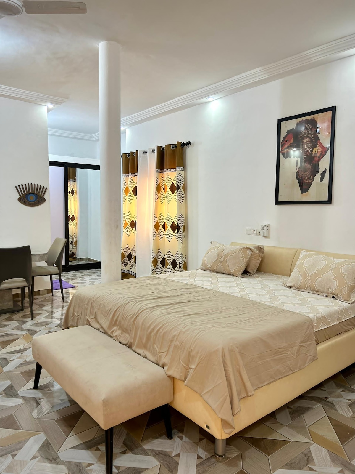 Authentic and comfortable architecture in this spacious studio located in the Adakpamé district of Lomé. The well-equipped room includes a 140 cm double bed, a private bathroom, a mini fridge, a wardrobe, and a large desk. The large private terrace, located on the first floor of a house surrounded by a carefully maintained garden, offers a welcoming space to cook and relax outdoors. The house, designed by an architect, follows bioclimatic design principles and is built with earth bricks.