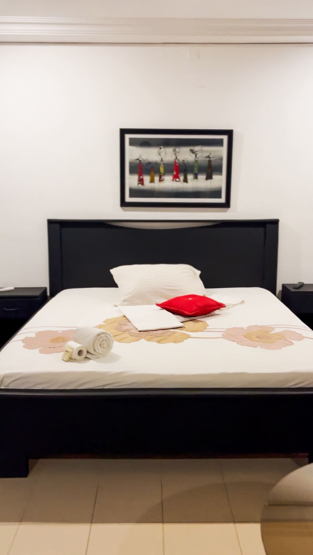 Appartement situé sur rue Agbata de 3 chambres et un double séjour très spacieux , équipé de mobiliers modernes. d'un balcon Vous êtes non loin de la plage et 1 km de centre ville et à deux pas du centre administratif ( air France , ambassade de France et d' Allemagne.. L'hébergement dispose de la climatisation , d'une télévision à écran plat, d'un lave linge, un four , Plaque four vitrocéramique, un réfrigérateur , un micro-onde , grille -pain, bouilloir etc... - électricités cash power à payer