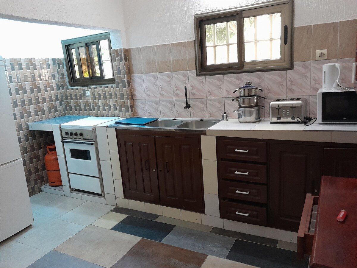 Cette petite maison à l'ambiance Afro chic est un véritable cocon. Elle est composée de 2 chambres , 1 salon, 1 salle a manger, 1 Salle de douche, WC séparé ainsi que la climatisation et 1 machine à laver. Tout est pensé pour vous offrir un séjour détente pour 4 personnes. Située dans un quartier vivant de Lomé (Adidoadin), la maison se situe dans une impasse calme. Son jardin et sa petite paillotte offre un espace parfait et sécurisé pour le repos et la détente.