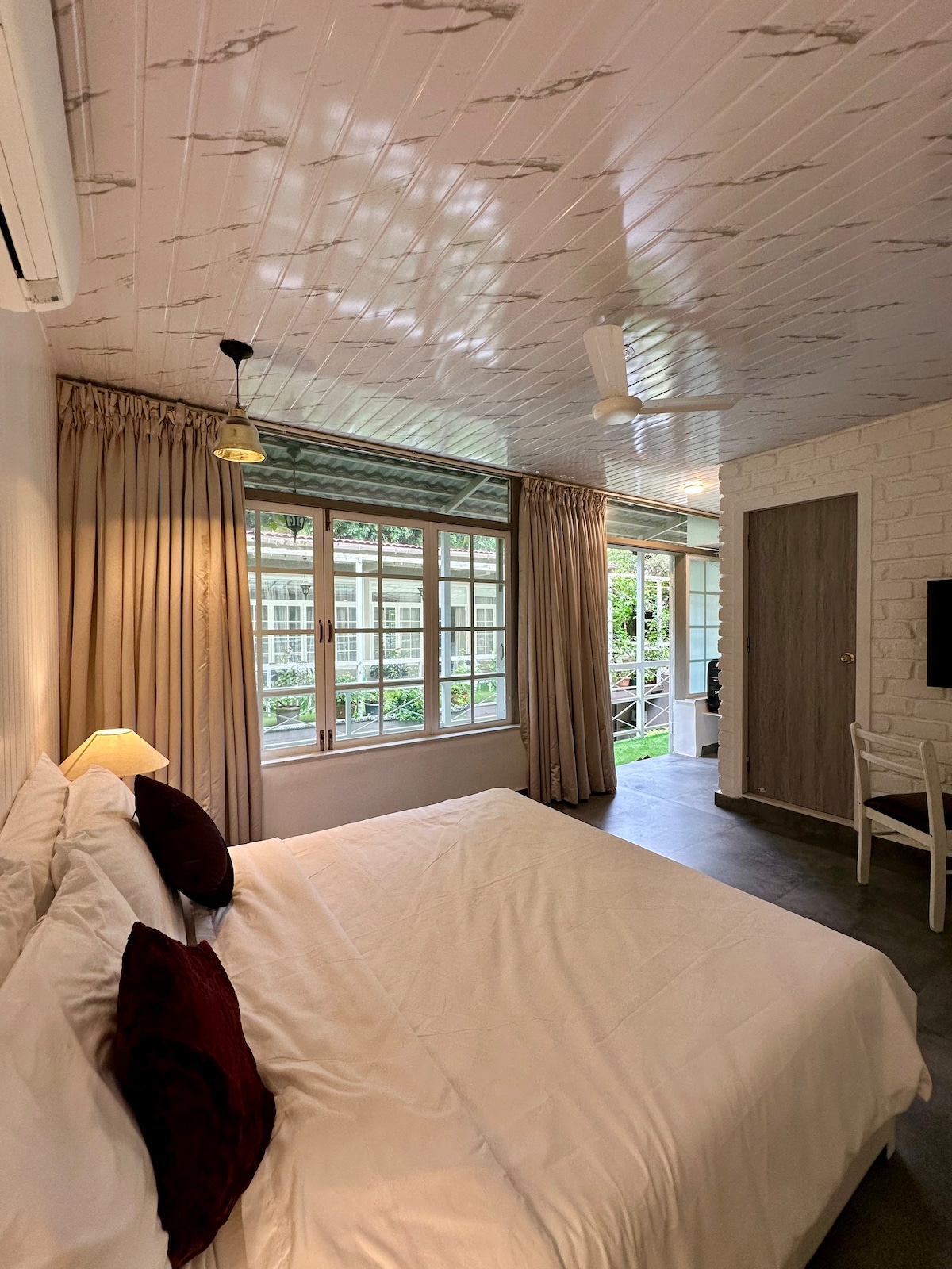 Bright, airy, and full of character, The Loft blends garden charm with a New-York inspired loft feel. Exposed white brick walls, tall French windows draped with rich silk curtains and soft natural light create a space that feels open yet grounded - perfect for slow mornings and relaxed evenings. Ideal for couples or solo travellers who enjoy simple design, natural light and a sense of quiet style. Adults only — where garden living meets understated loft charm at the House of Shrof.