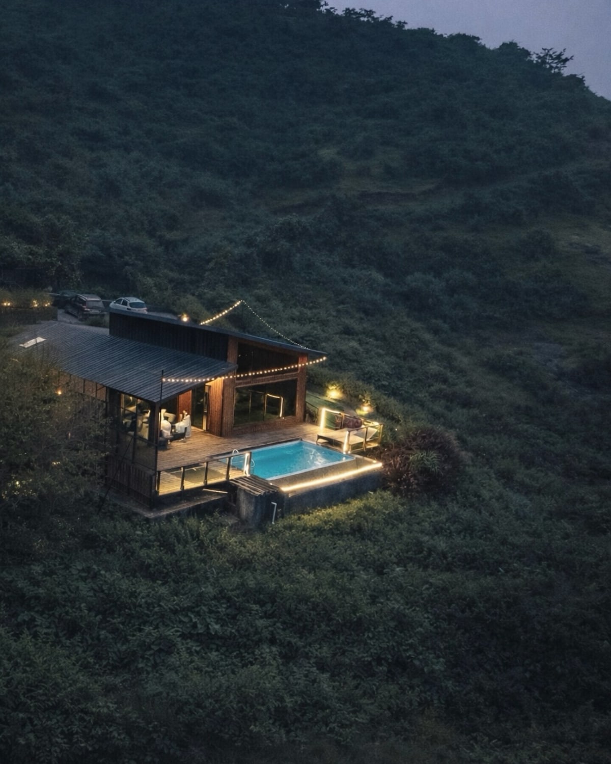 The 3-Bedroom Kabin is a spacious, fully private mountain home near Pawna Lake, ideal for families and groups seeking comfort, views, and complete seclusion in nature. The Kabin features a private infinity pool overlooking the valley, a beautifully lit garden, and a deck with panoramic valley views, creating a relaxed setting for slow, stays away from the city.