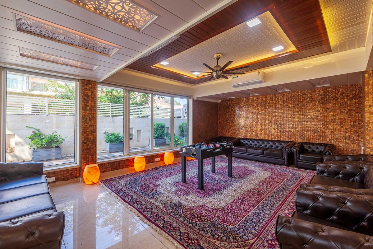 Experience a royal getaway in this luxurious 4BHK villa with a private pool, indoor games, and daily housekeeping. Perfect for families and groups, the villa offers a serene retreat with plush interiors and personalized services. Enjoy pure vegetarian meals with Jain options available on request. Book now for an unforgettable, fully serviced stay!free parking,private lift in villa,