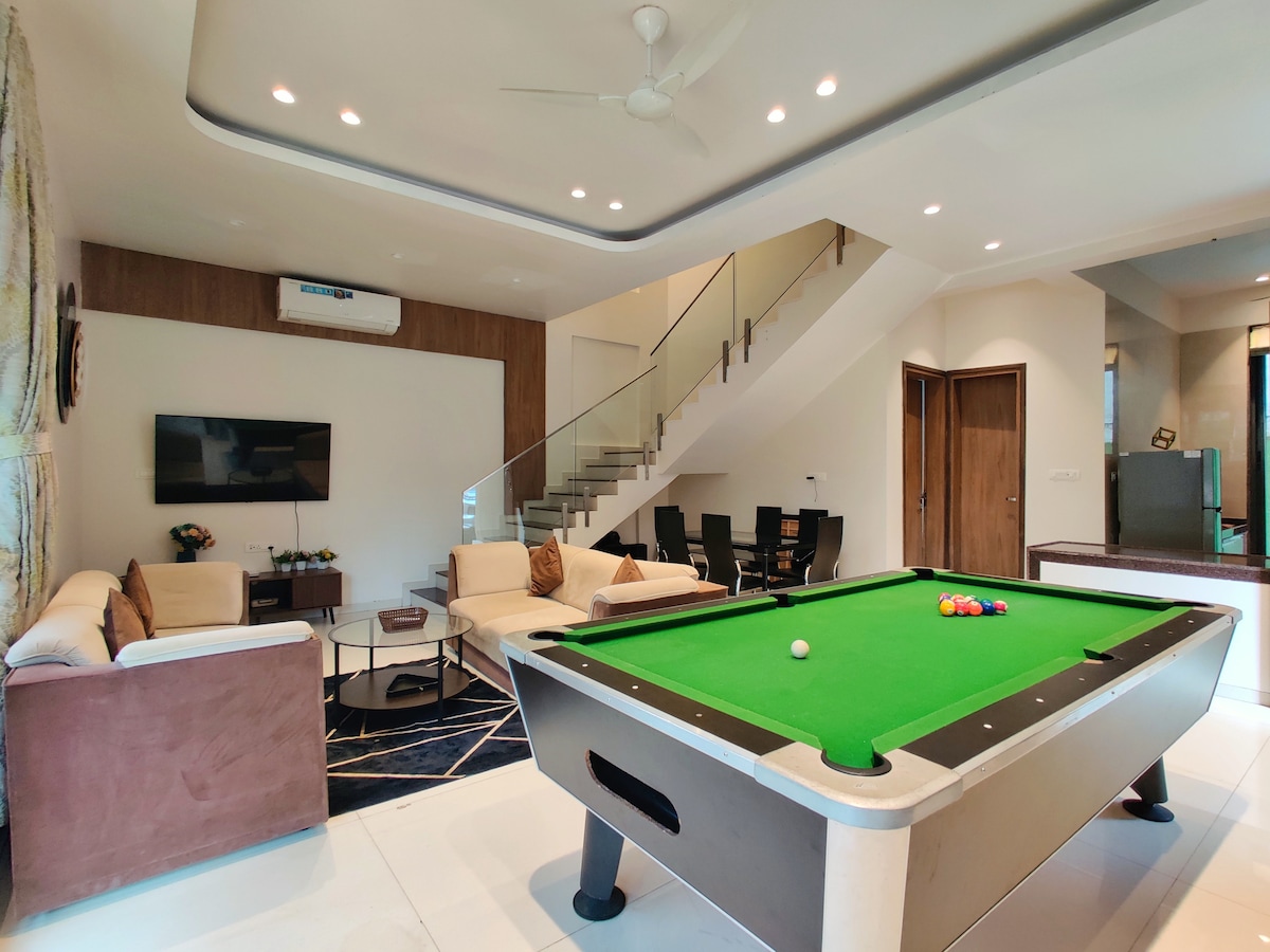 Experience a royal getaway in this luxurious 4BHK villa with a private pool, indoor games, and daily housekeeping. Perfect for families and groups, the villa offers a serene retreat with plush interiors and personalized services. Enjoy pure vegetarian meals with Jain options available on request. Book now for an unforgettable, fully serviced stay!free parking,private lift in villa,