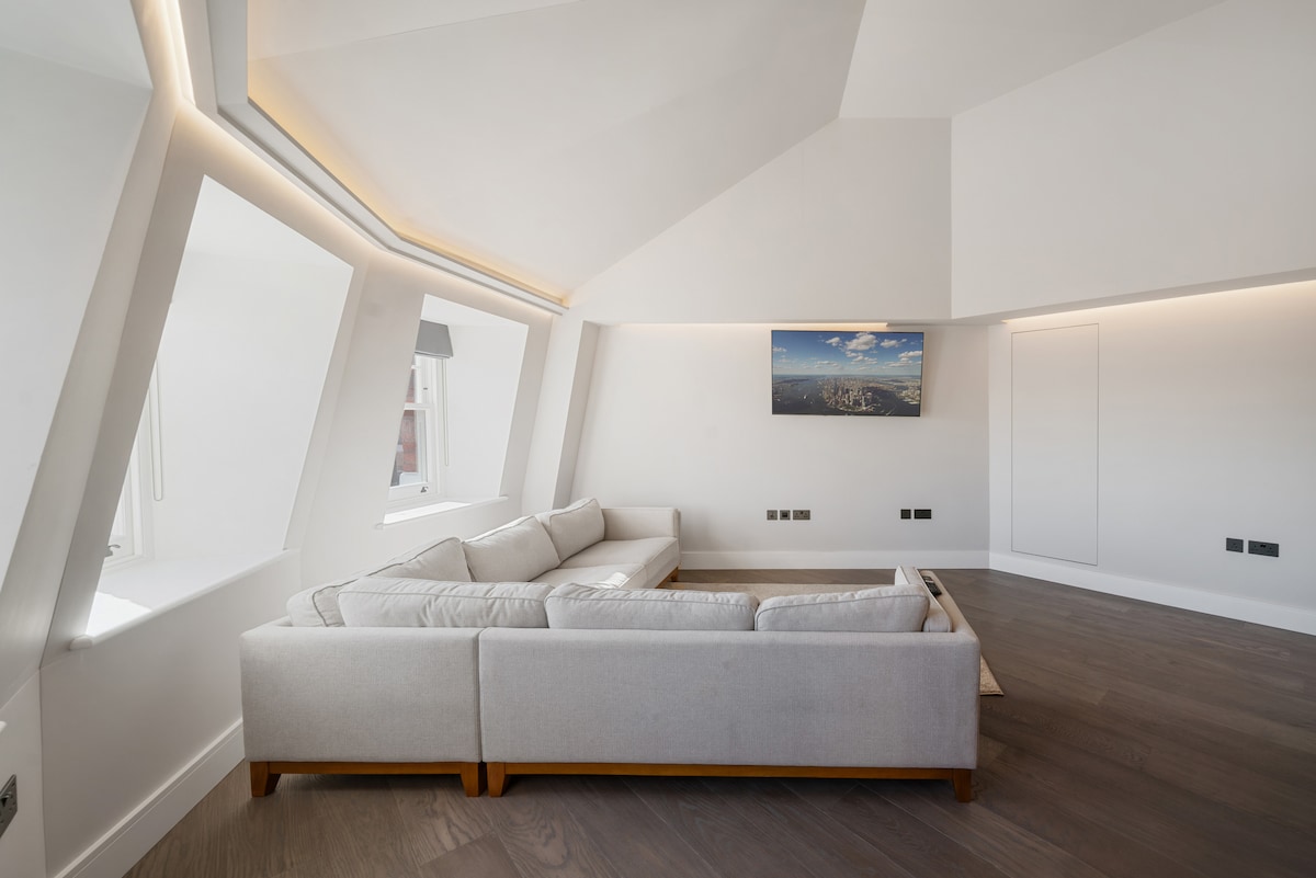 High-spec newly built flat 1 min from tube. Premium features: Dramatic 4m ceiling living room, Starlink high-speed internet, wood floors, designer kitchen, Bosch appliances, spa bathrooms, underfloor heating, hot & cold air conditioning, smart TV, large wardrobe, double-glazed windows. etc. Sleeps 6, king beds, private entrance. Hampstead Village restaurants nearby. Perfect London base for families, professionals, tourists. Easy Central London access. Luxury accommodation Hampstead NW3.