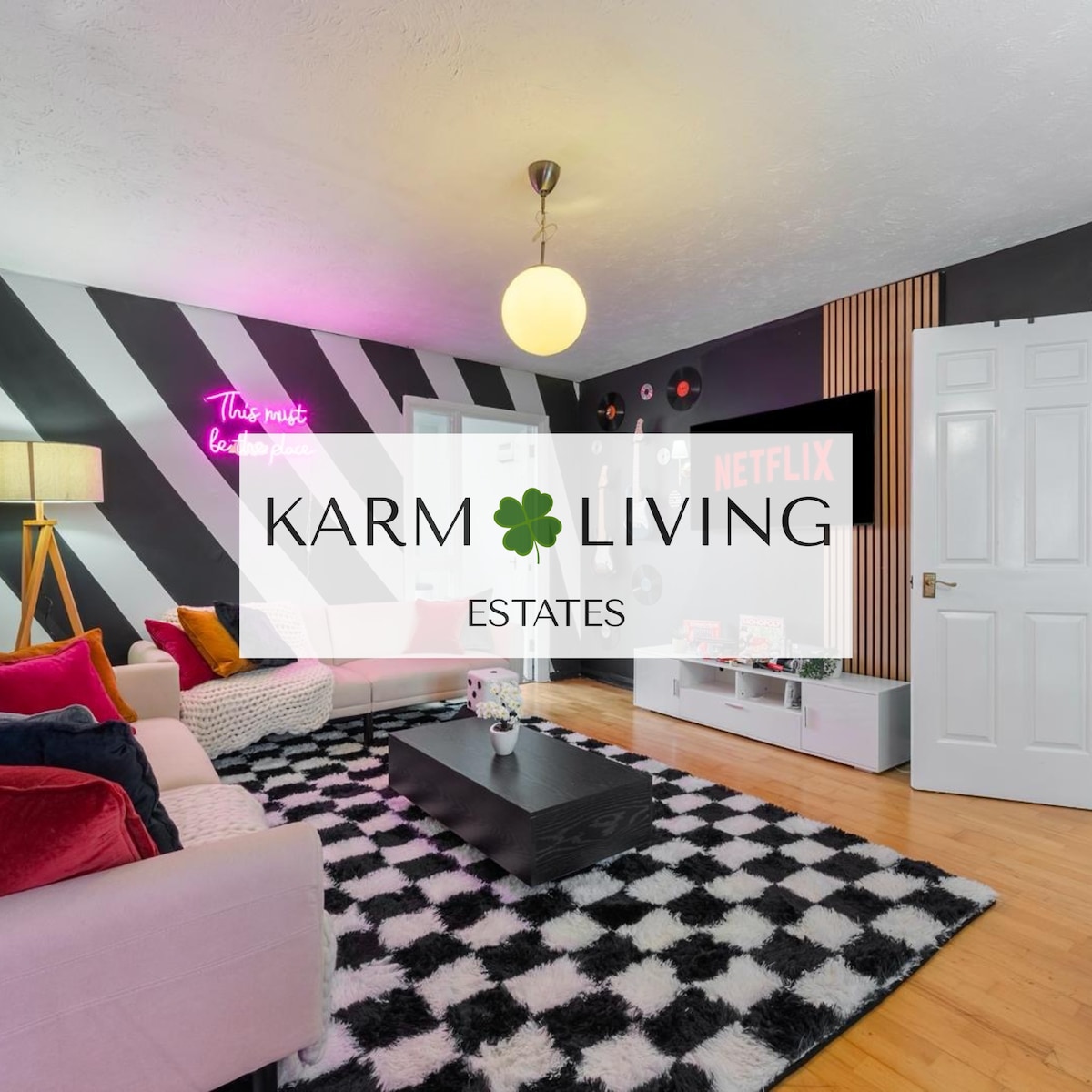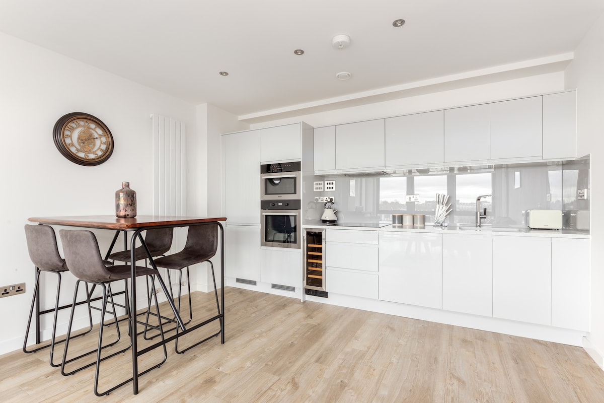 Overlooking the fields, this luxury top floor space invites you to unwind. Ultra-clean, peaceful and beautifully styled. Equipped with everything you need and more. Brew fresh bean-to-cup coffee with the Ninja Luxe Coffee Machine. Stream your favourite shows on the Smart TVs, play board games as a group or work where the view inspires you. Whatever the purpose of your stay, working or relaxing - this is the place to be! London is close by, but feels like a world away. Always a place to park too!