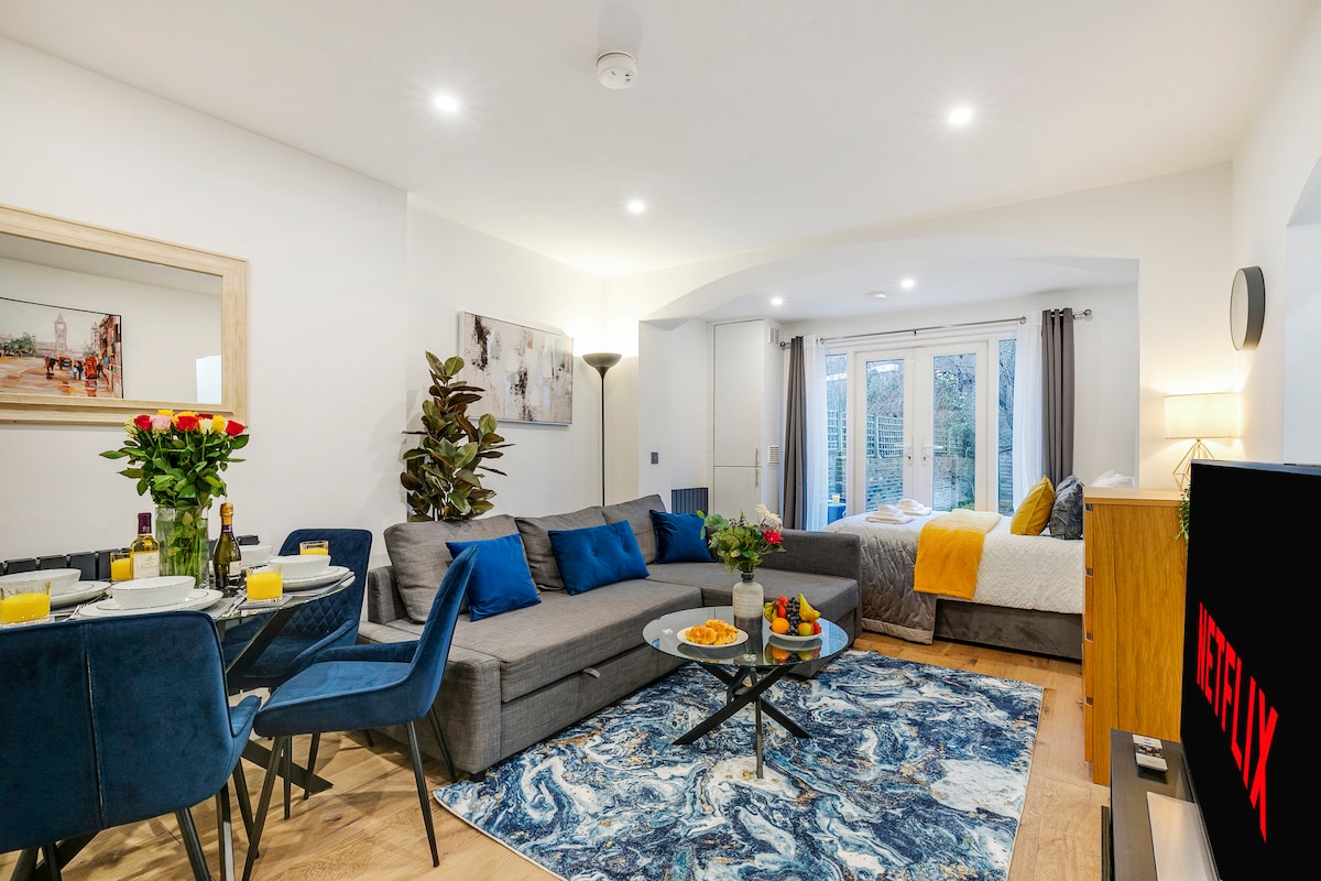 Kick back and relax in this calm, modern, homely space. In the middle of London, this flat, whether for business or leisure, provides the perfect respite after a long, busy day of meetings or sightseeing. Quiet in a residential neighbourhood, you’re only moments away from all that London has to offer. With your own access, you are free and flexible, though we are just across the garden for any questions to help navigate London.