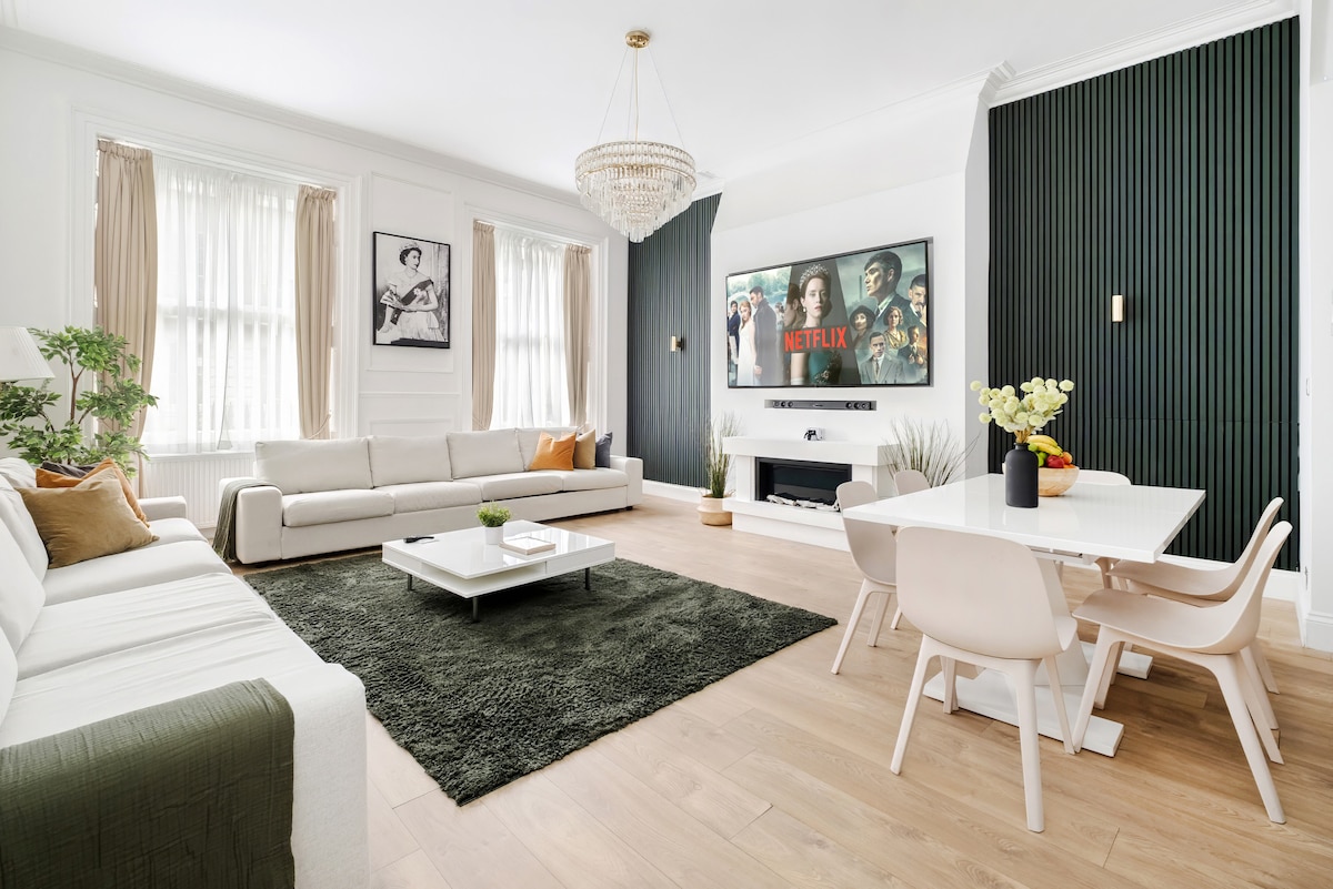 Located in the ♥️ of Marylebone, this sophisticated apartment features soaring ceilings and a spectacular 90-inch TV, perfect for cosy movie nights. Just moments from Marylebone High Street, voted London's best and most beautiful high street five years in a row, with its chic boutiques and cafés right on your doorstep. Featuring two bedrooms, three full bathrooms, an open plan living room and kitchen, and a private garden with seating and BBQ facilities. A truly refined London base.