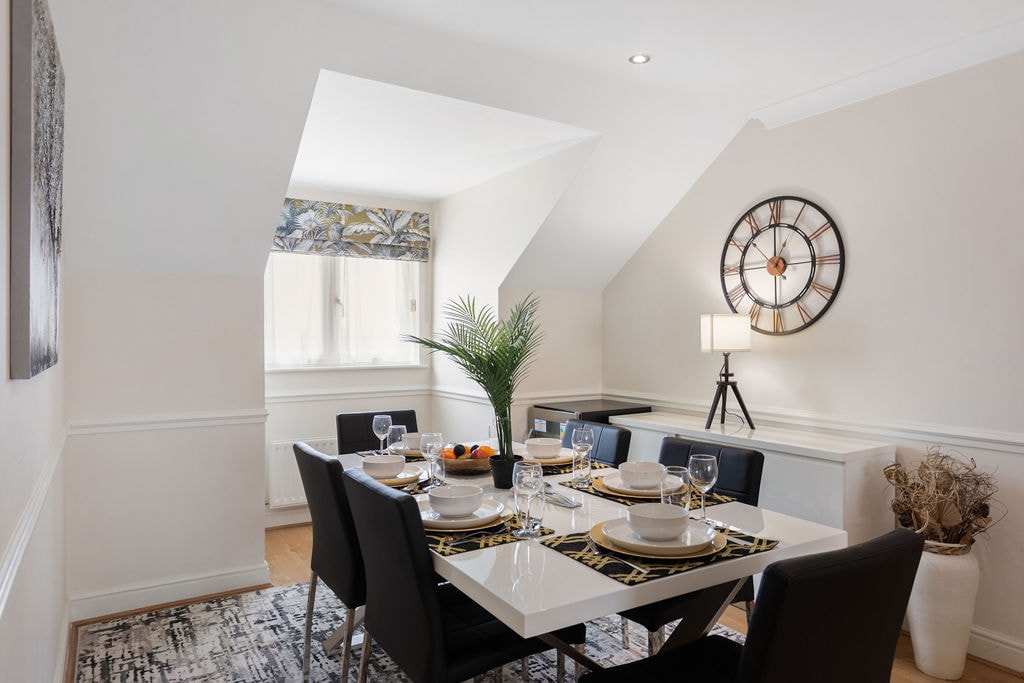 Overlooking the fields, this luxury top floor space invites you to unwind. Ultra-clean, peaceful and beautifully styled. Equipped with everything you need and more. Brew fresh bean-to-cup coffee with the Ninja Luxe Coffee Machine. Stream your favourite shows on the Smart TVs, play board games as a group or work where the view inspires you. Whatever the purpose of your stay, working or relaxing - this is the place to be! London is close by, but feels like a world away. Always a place to park too!