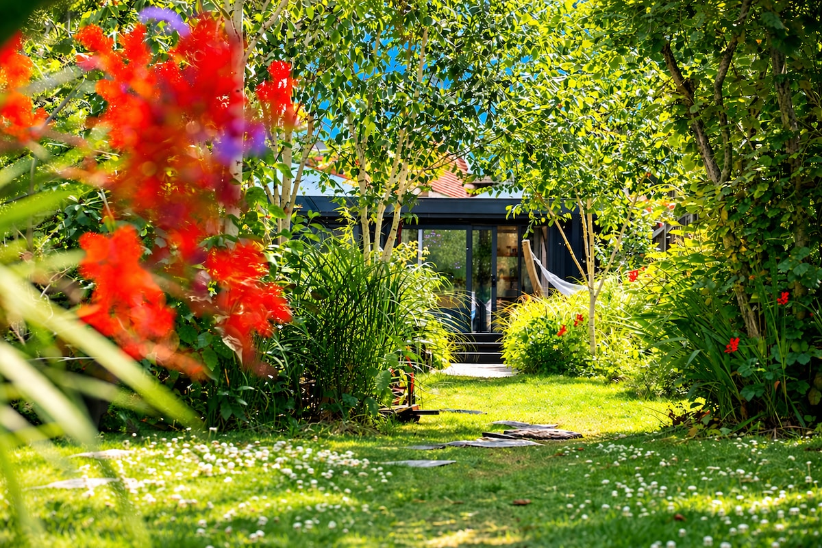 We are a peaceful, modern, minimalistic & carbon zero detached cabin. Very private, very secure, tucked away, surrounded by trees, plants, birds and nature, you'll think you're in the country. It has its own private garden and entrance. The cabin is built from slow-grown larch and has triple glazed doors. Inside is fitted out with sustainable materials like birch ply-panelling and plant based flooring, and we an MVHR clean air system. We harvest rainwater, compost and power by ASHP.